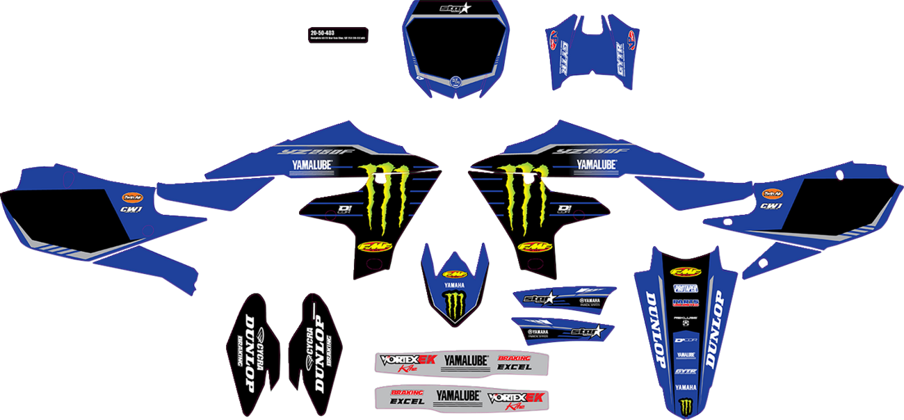 - Includes decals for radiator shrouds, tank, number plate, airbox, lower fork guards, front fender, rear fender and swingarm