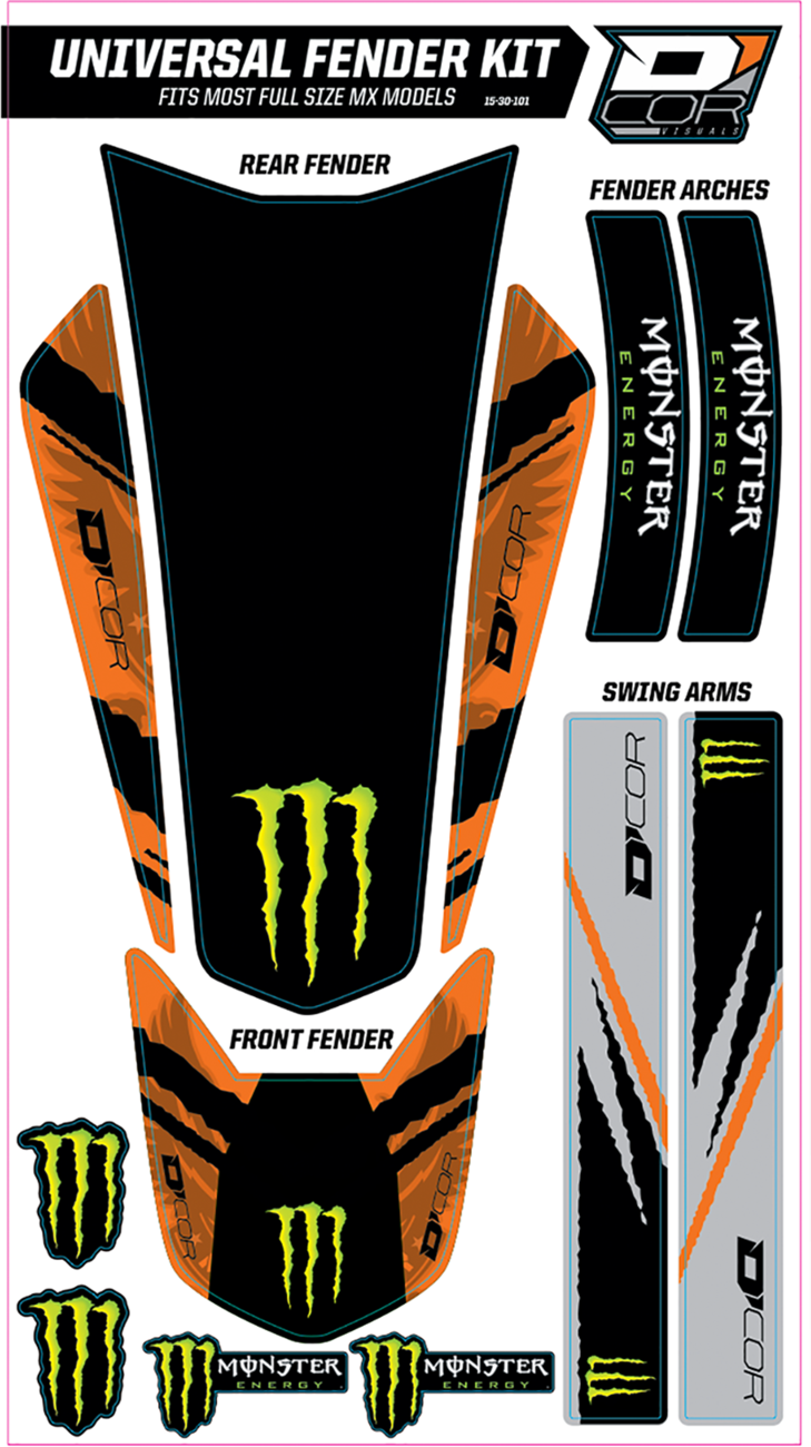 - Includes graphics for front fender, rear fender, fender arches and swingarm