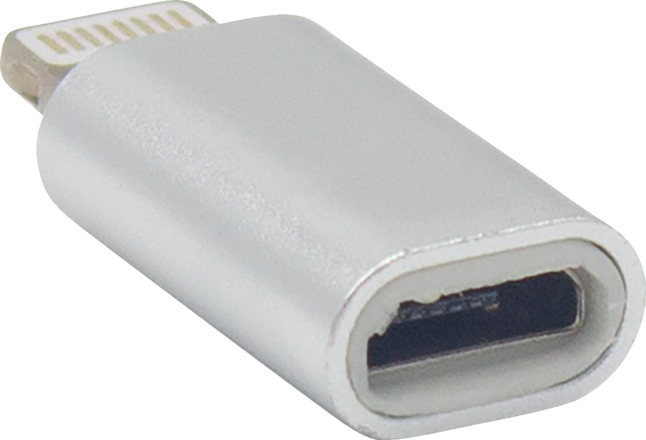 - Female micro USB to male lightning adapter connects between a cable with a male micro USB and a device with a lightning port to charge your device