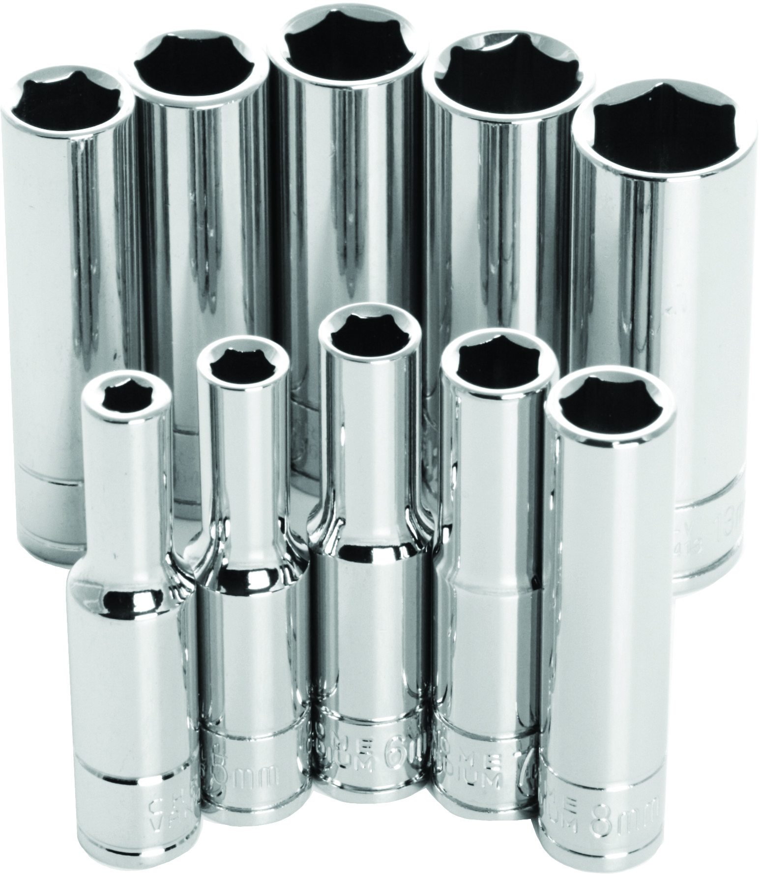 - Metric socket sets include: 4 mm, 5 mm, 6 mm, 7 mm, 8 mm, 9 mm, 10 mm, 11 mm, 12 mm and 13 mm sockets