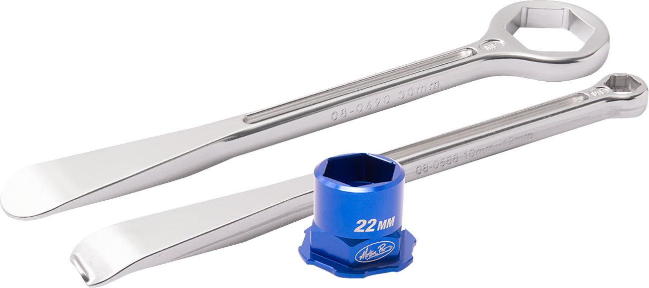 - Second wrench has hex box wrench for 30 mm axle nuts on other end