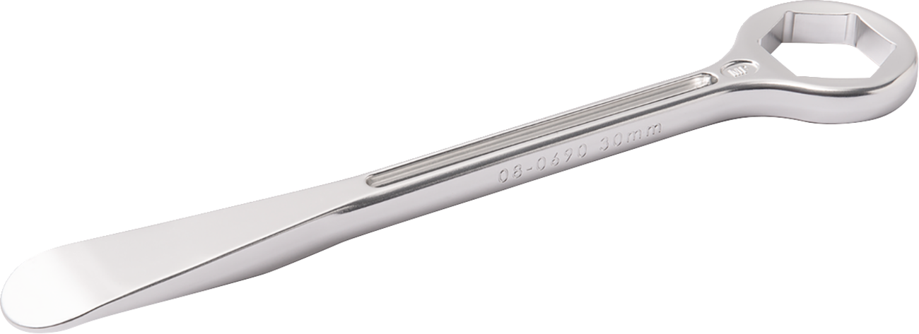- Contoured tire spoon on one end, hex box wrench for 30 mm axle nuts on the other end
