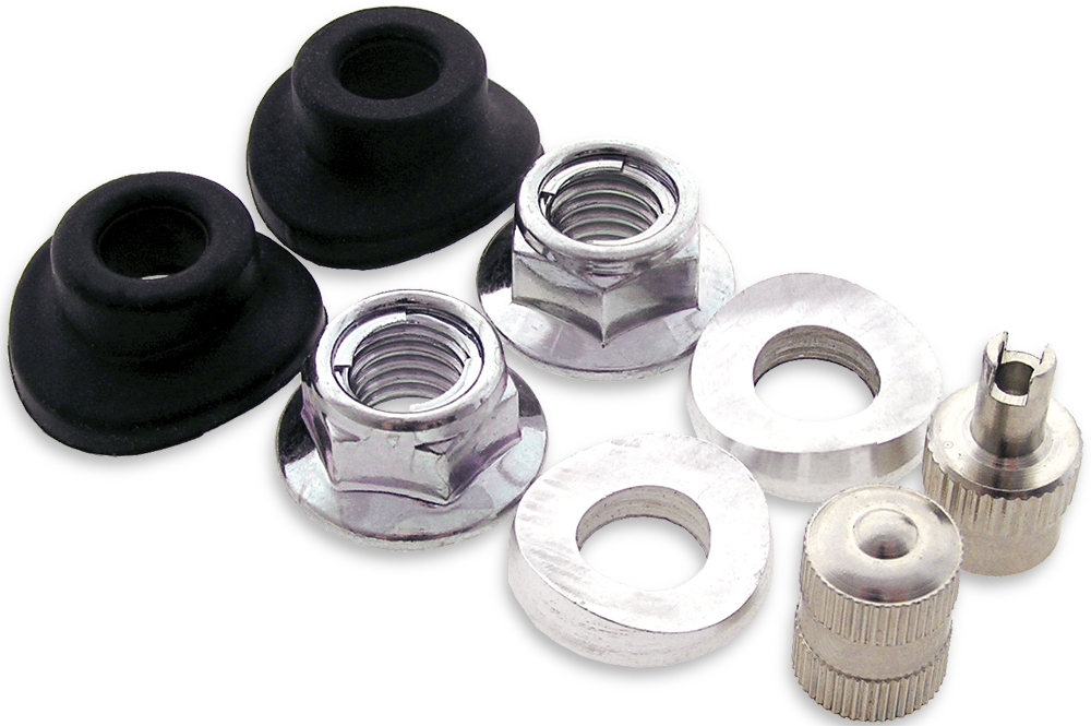 This kit effectively seals out dirt and moisture at the valve and rim stems with contoured grommets and aluminum rim-lock spacers & NBSP. One valve stem cap includes handy built-in valve stem remover tool & NBSP and includes two of each: M8 metal locking flange nuts, aluminum rim-lock spacers, ribber grommets and polished metal valve stem caps.