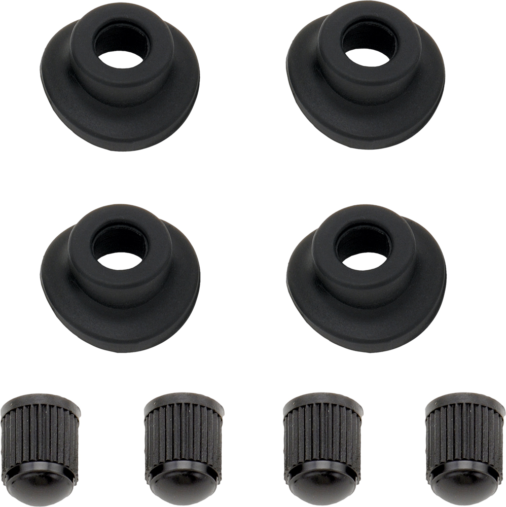 Durable rubber grommets are contoured to seal tightly around valve stems and seal out dirt and moisture which can cause friction, corrosion and flats. Set of four grommets and four black plastic valve stem caps.