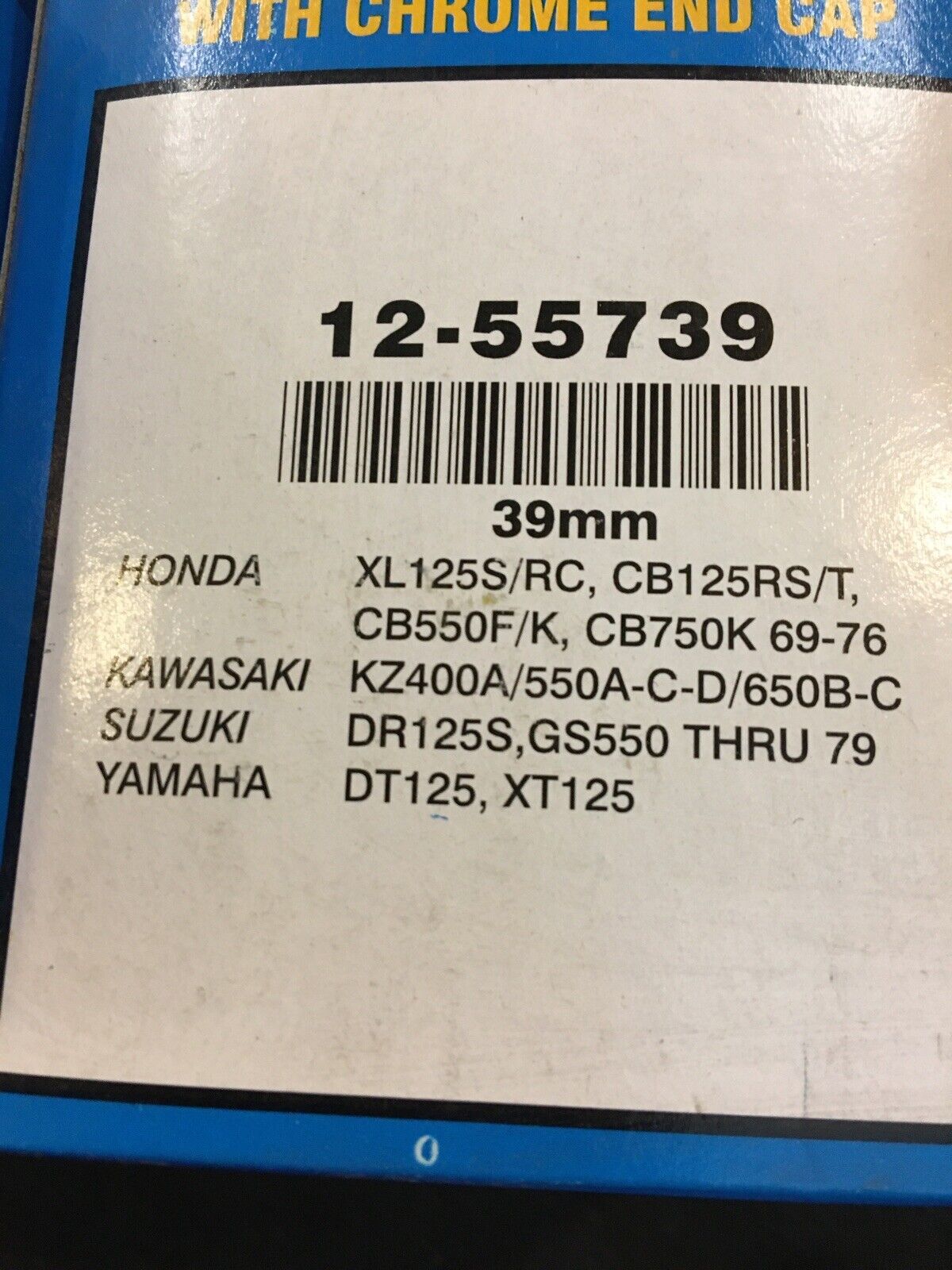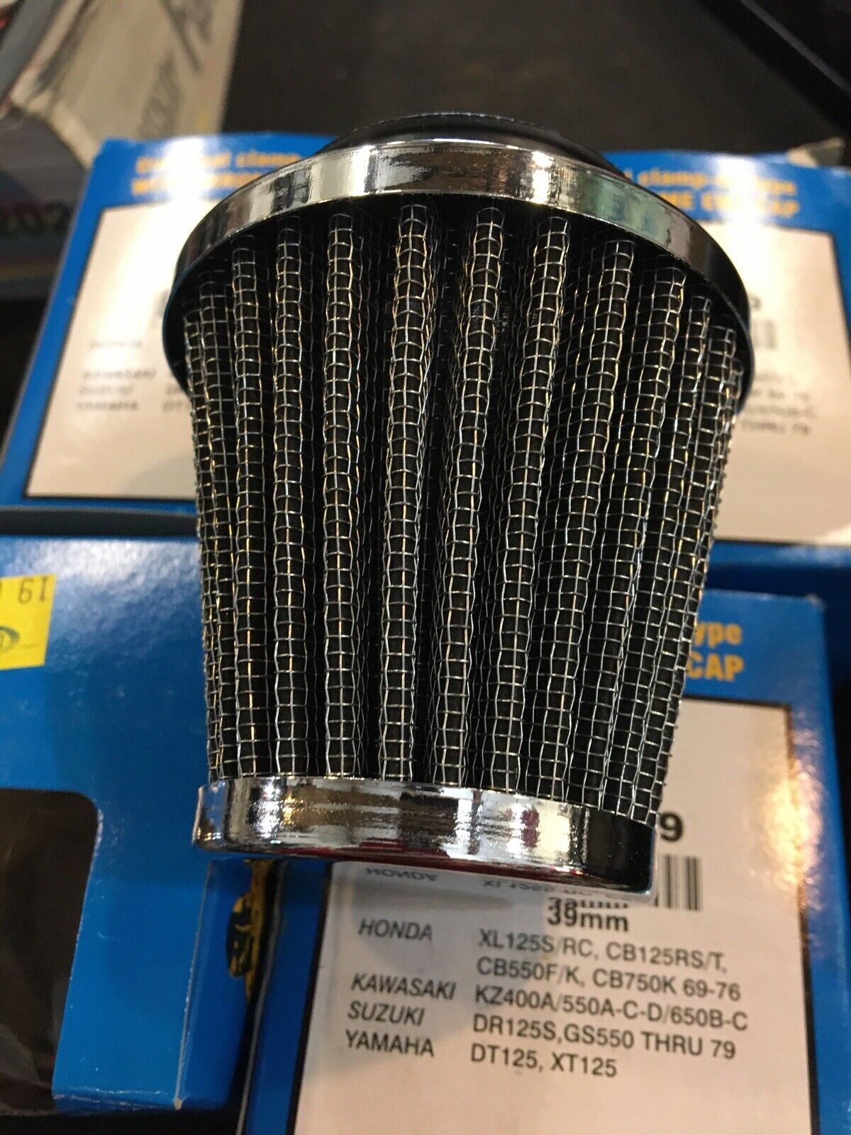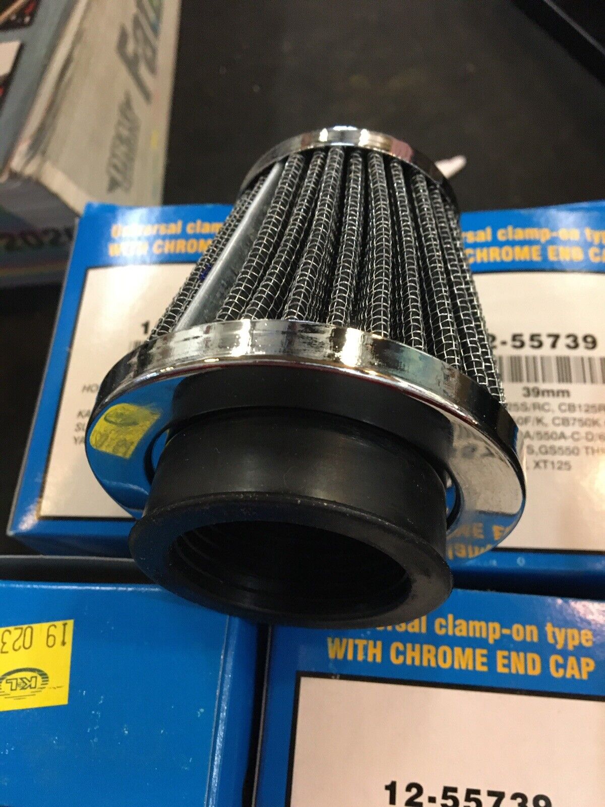 EMGO 39mm Clamp-on Type Tapered Air Filters With Chrome End Cap #12-55739. Condition is “New”.sold as quantity 4. Overall length is 3-1/4”. Fits Honda CB550F/K and CB750K 69-76’ as well as other applications buyer is responsible for fitment and applications no returns