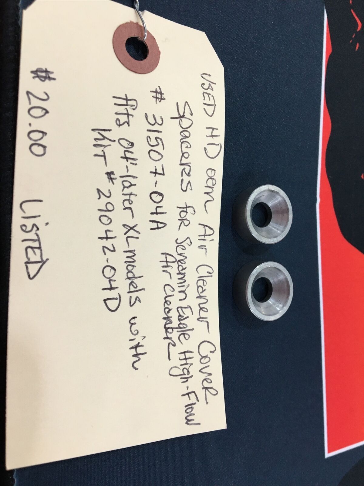 Harley Davidson oem Air Cleaner Cover Spacers for Screamin Eagle High-Flow Air Cleaner #31507-04A. Condition is used. Quantity of 2. Fits 04’-later XL models with High-Flow kit #29042-04D. Buyer is responsible for fitment and applications