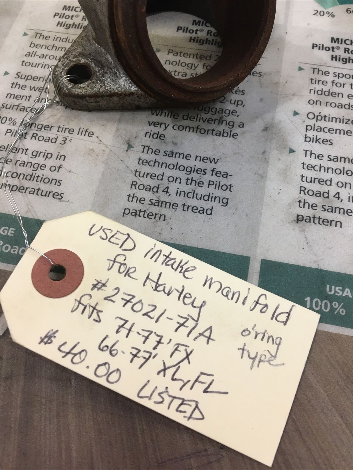 Intake manifold for Harley #27021-71A. Condition is used. Fits Harley Davidson 71-77’ FX, 66-77’ XL, FL models buyer is responsible for fitment and applications