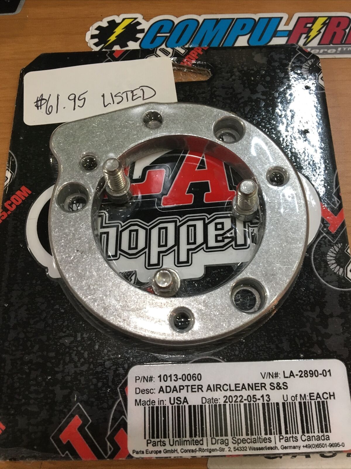 LA Choppers S&S Air Cleaner Adapter #1013-0060. Condition is new. Will also work for mounting other air cleaner kits designed to mount CV carburetors; not for use with Arlen Ness Big Sucker Air Cleaners buyer is responsible for fitment and applications