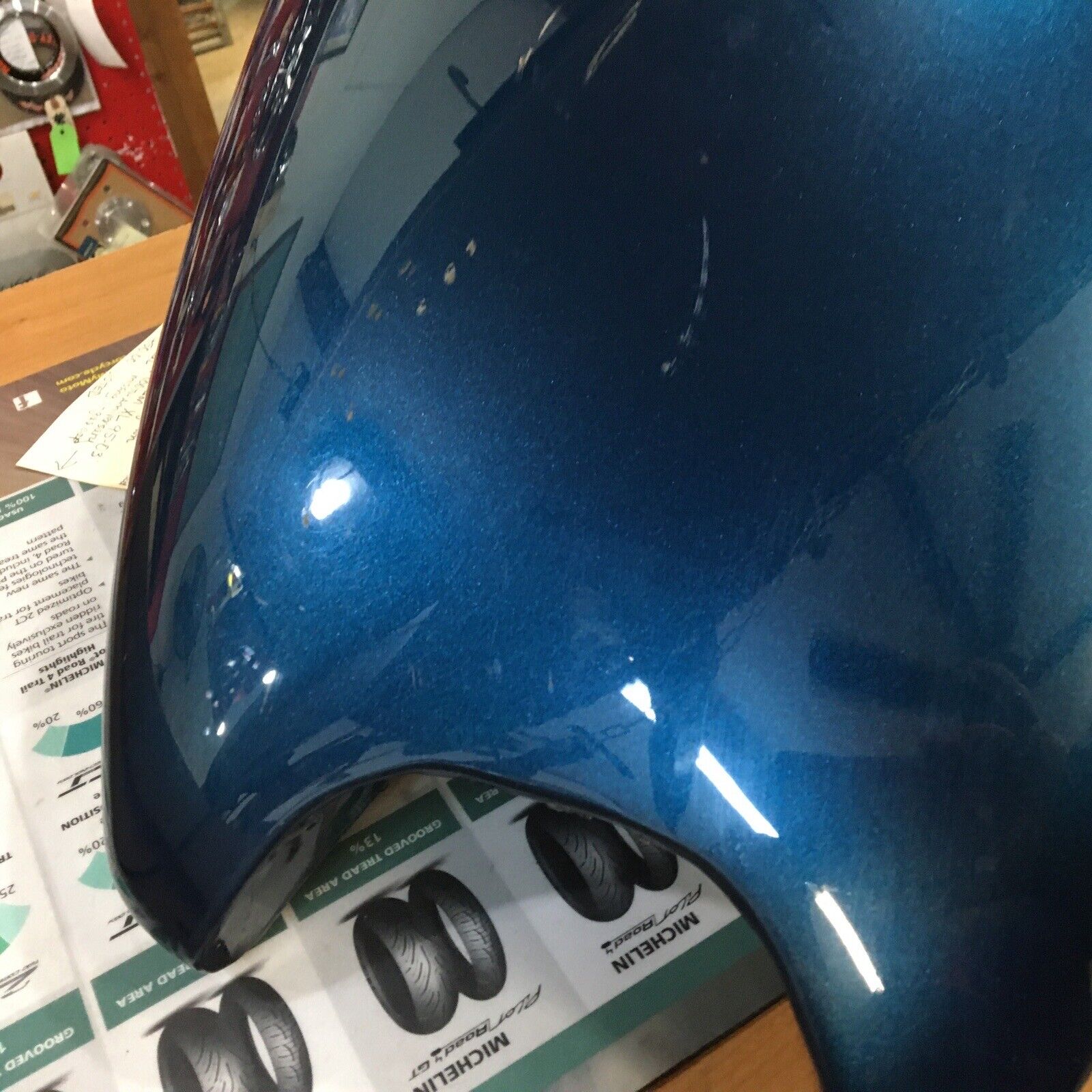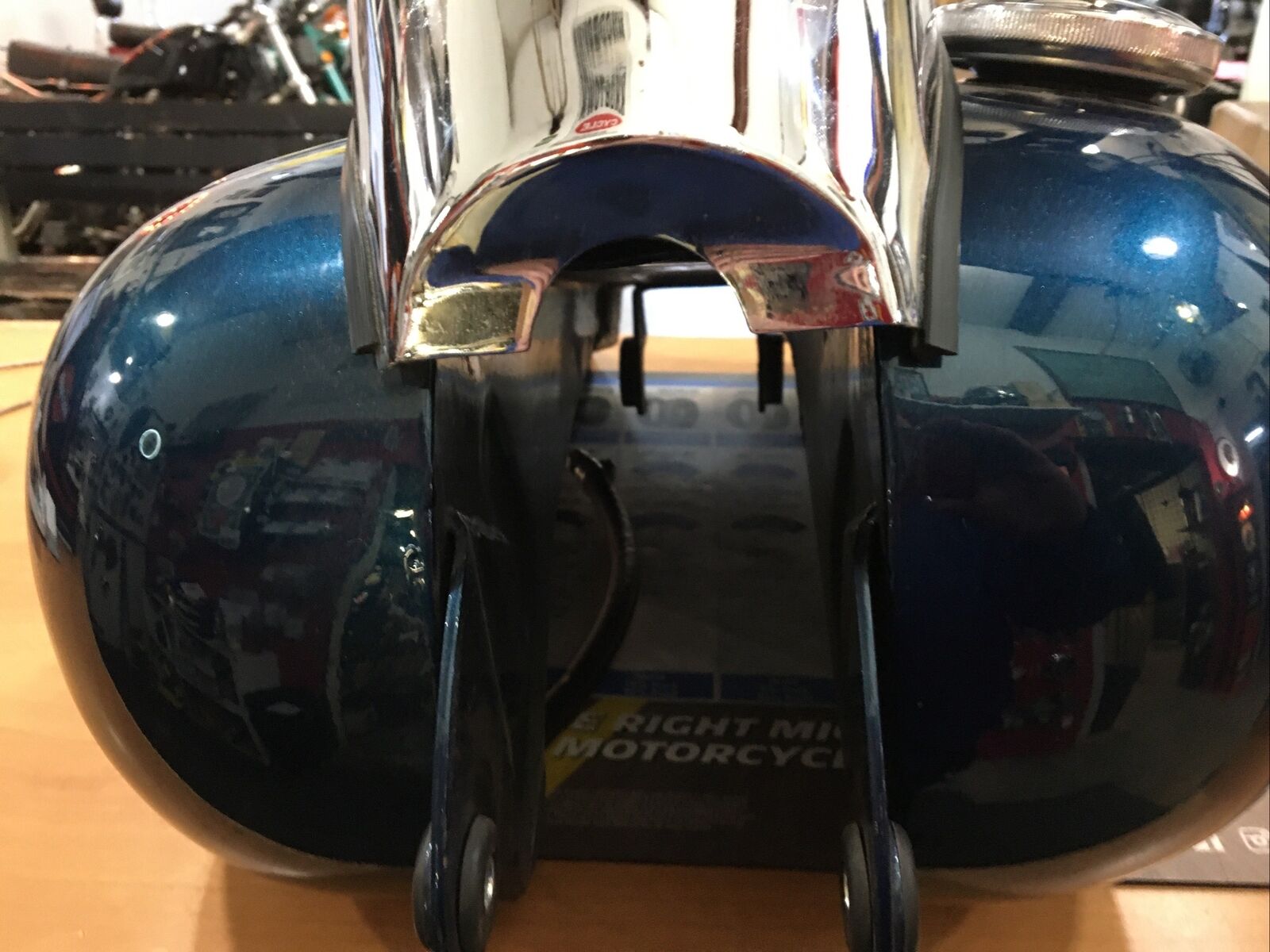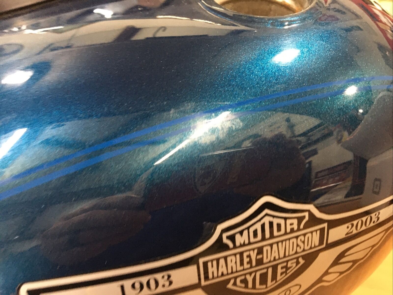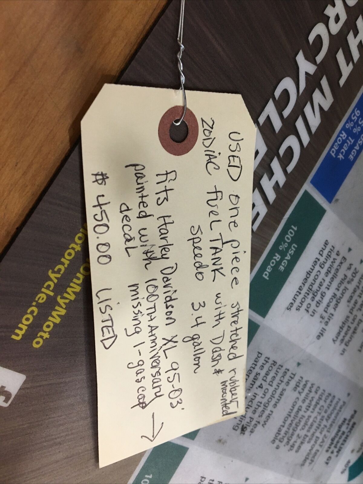 One piece stretched rubber mounted fuel tank 3.4 gallon with dash and speedo. Condition is used. Has some scratches and scuffs as seen in pictures. Missing 1 gas cap. Painted with 100th Anniversary decals. Fits Harley Davidson 95-03’ XL models buyer is responsible for fitment and applications
