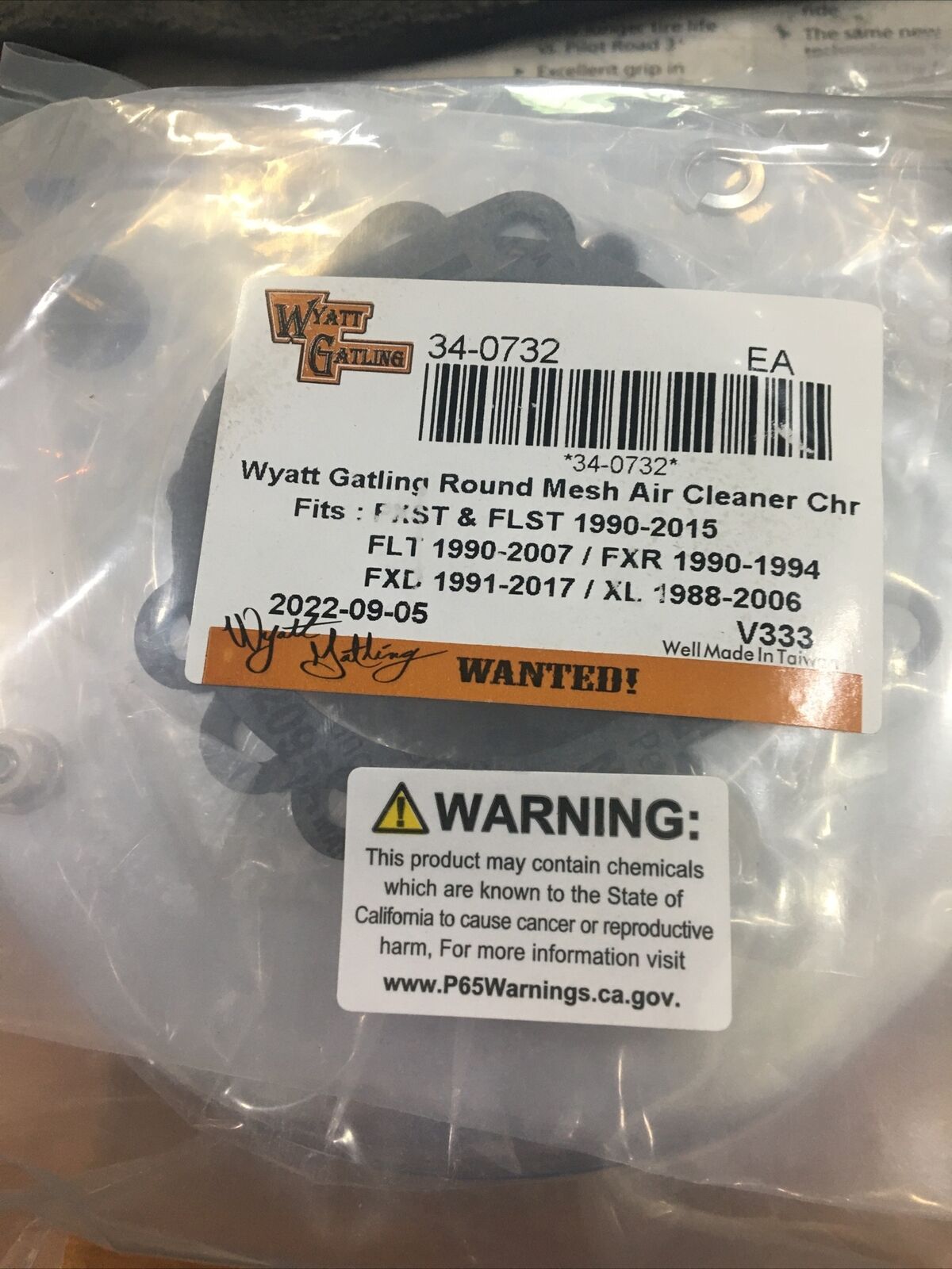 Wyatt Gatling chrome round mesh air cleaner #34-0732. Condition is new. Fits Harley Davidson 90-15’ FLST, FXST and 91-17’ FXD, 88-06’ XL, 90-07’ FLT, 90-94’ FXR models must order bracket or breather kit separately fits models with CV carburetors or EFI buyer is responsible for fitment and applications