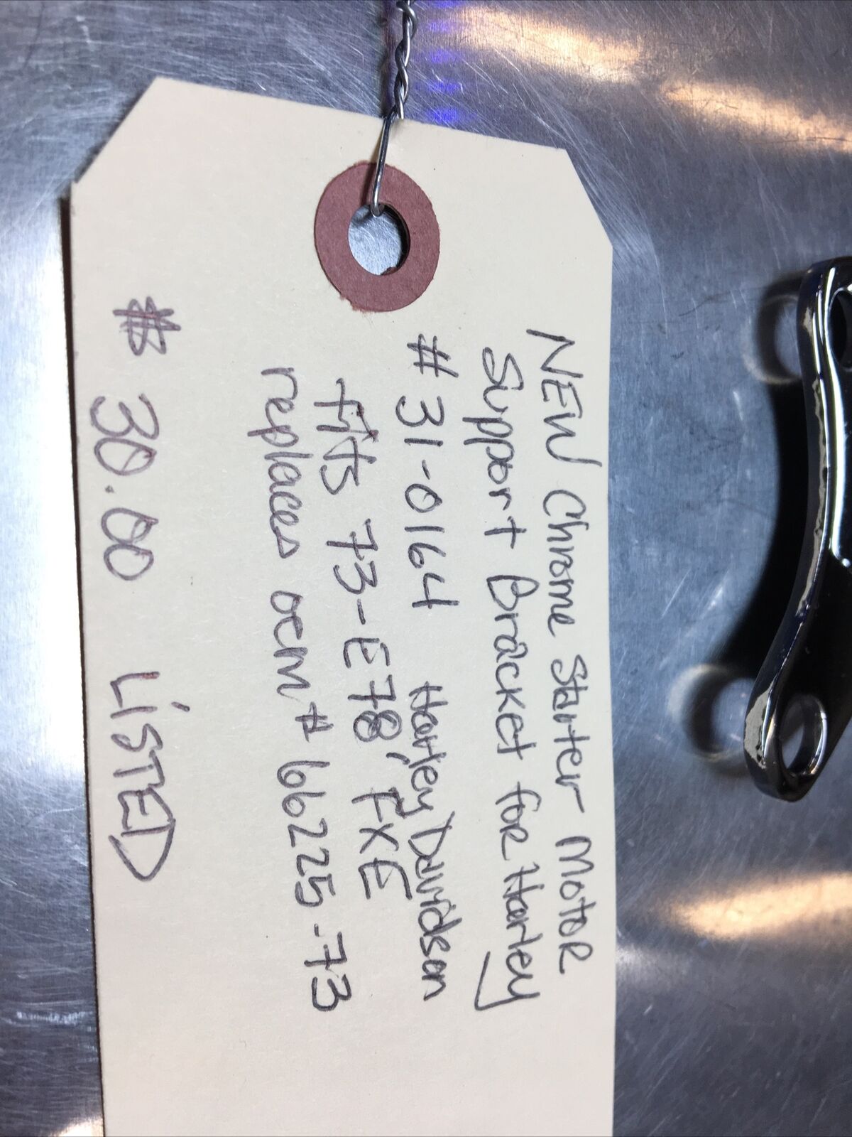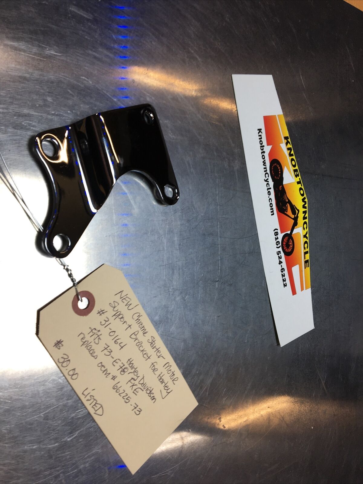 Chrome Starter Motor Support Bracket For Harley #31-0164. Condition is new has some shelf wear. Fits Harley Davidson 73-E78’ FXE models replaces oem #66225-73. Buyer is responsible for fitment and applications