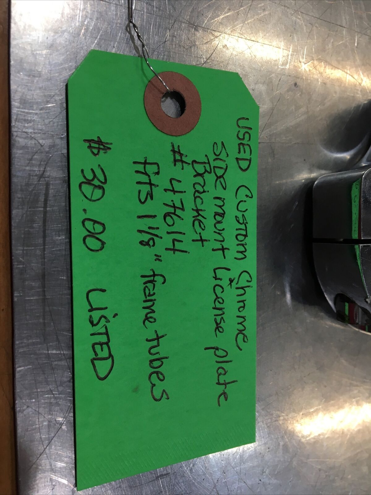 Custom Chrome Side Mount License Plate Bracket #47614. Condition is used. Fits 1-1/8” frame tubes buyer is responsible for fitment and applications