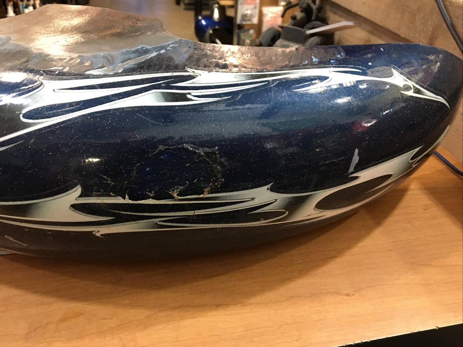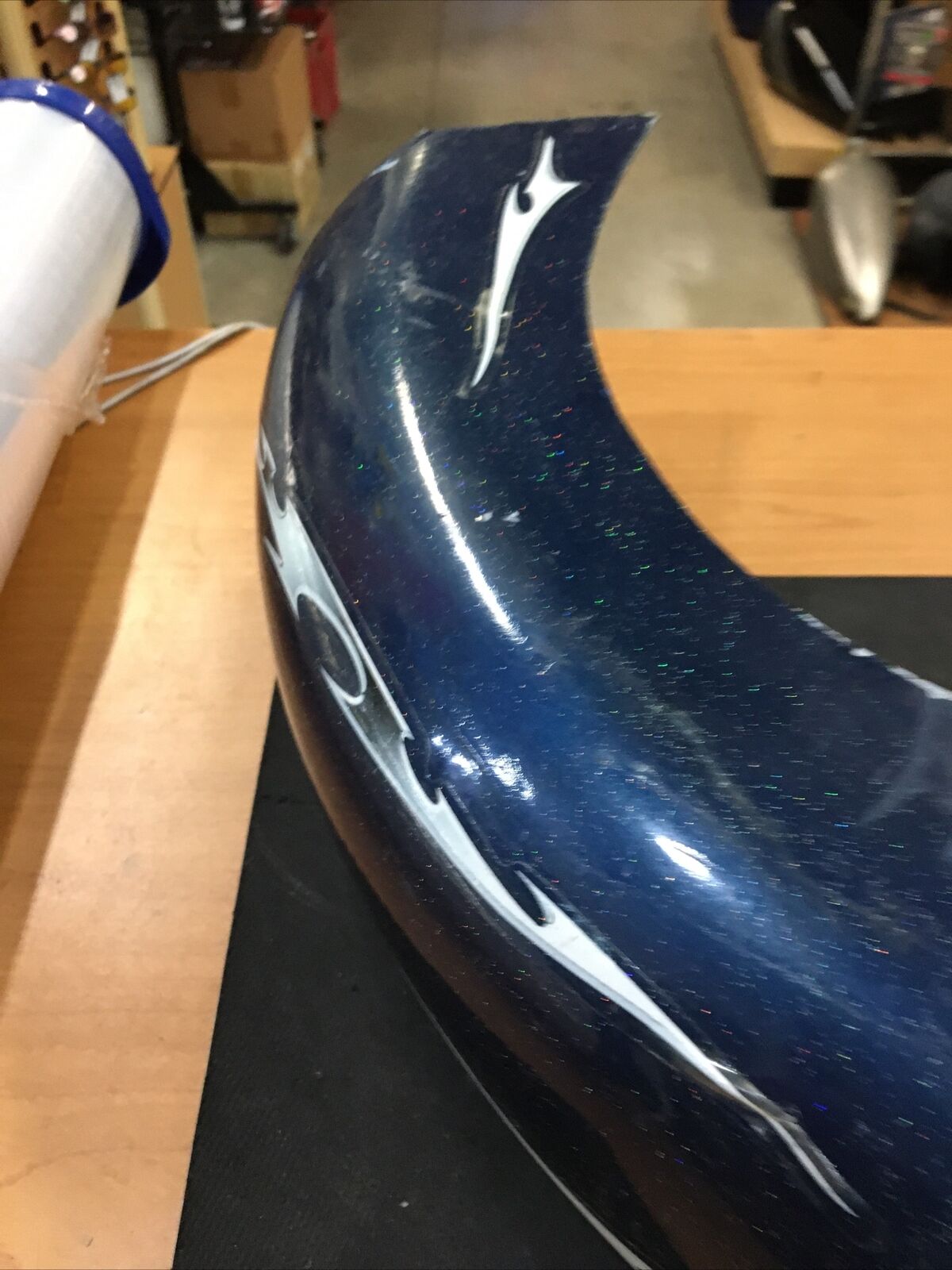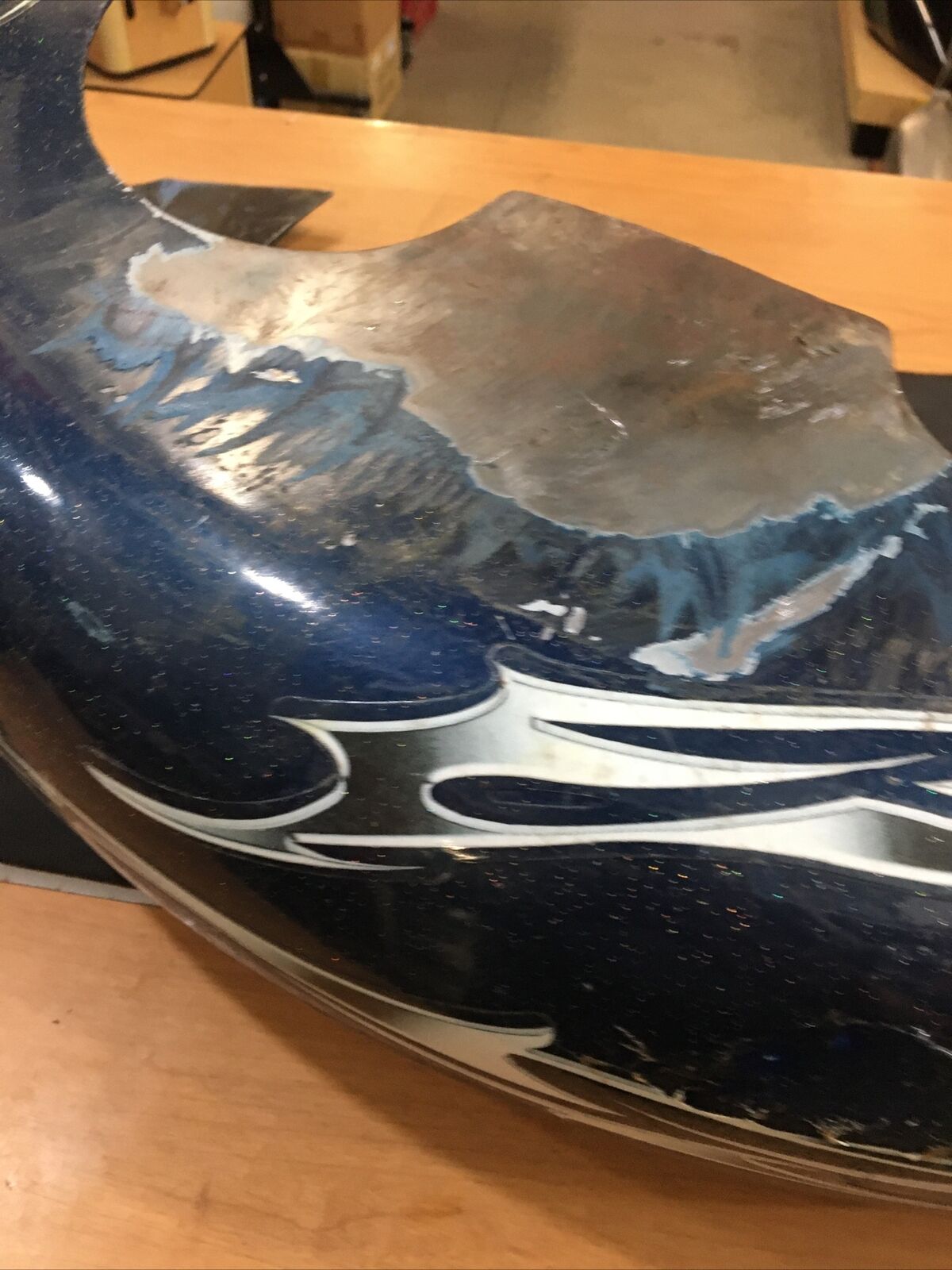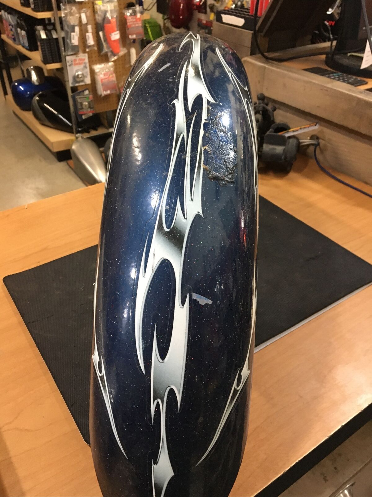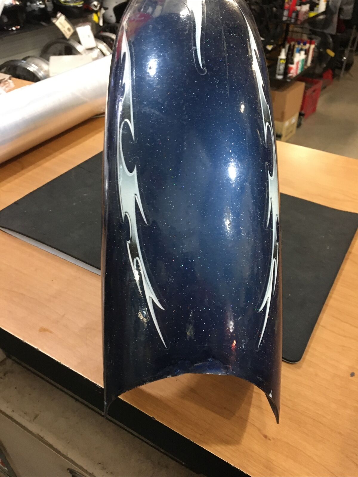 One of the standout features of the Custom Steel Front Fender is its self-drill attribute, which allows for easy installation without the need for additional tools or equipment. This means that you can quickly and effortlessly upgrade your bike’s front end without any hassle. And while this front fender may be used, it is in excellent condition with no drilling required. However, it may need to be repainted due to some chips, scratches, and dried glue spots, as shown in the pictures.