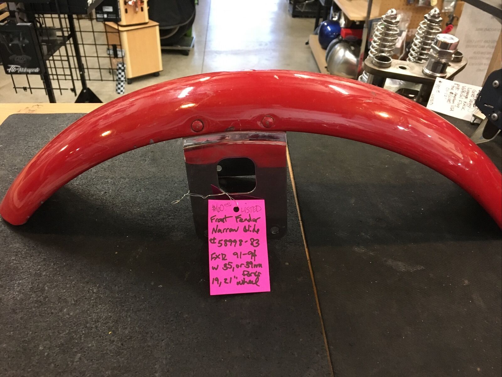 Front Fender Narrow Glide #58998-83. Condition is “Used”.scratched and chipped and rivets are loose. fits Harley Davidson 91-94’ FXR models with 35mm or 39mm forks and 19” or 21”wheel. buyer is responsible for fitment and applications no returns