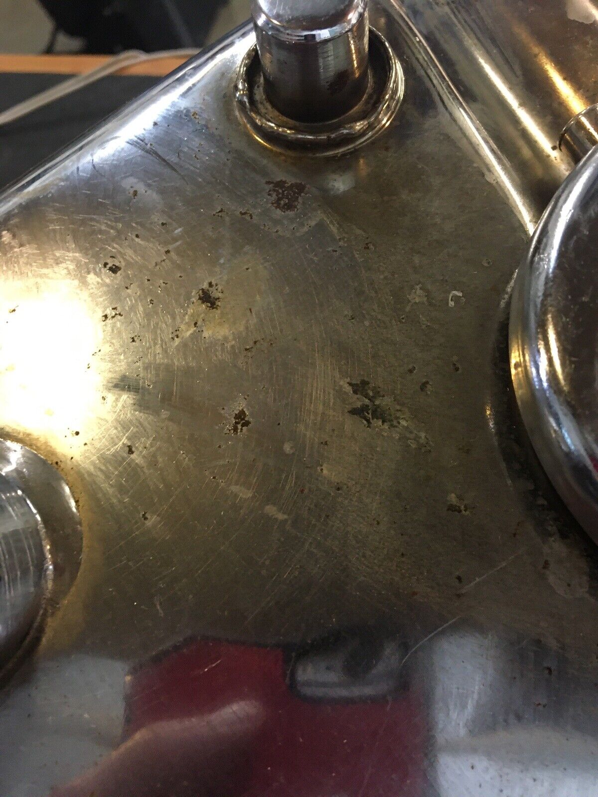 Despite being used, this oil tank still exudes a sense of rugged charm with its chrome finish. The wear and tear on the tank, including pitting and spots of oxidation, only add to its character and authenticity. It tells a story of countless rides and adventures, making it a valuable collector’s item for any Harley enthusiast.
