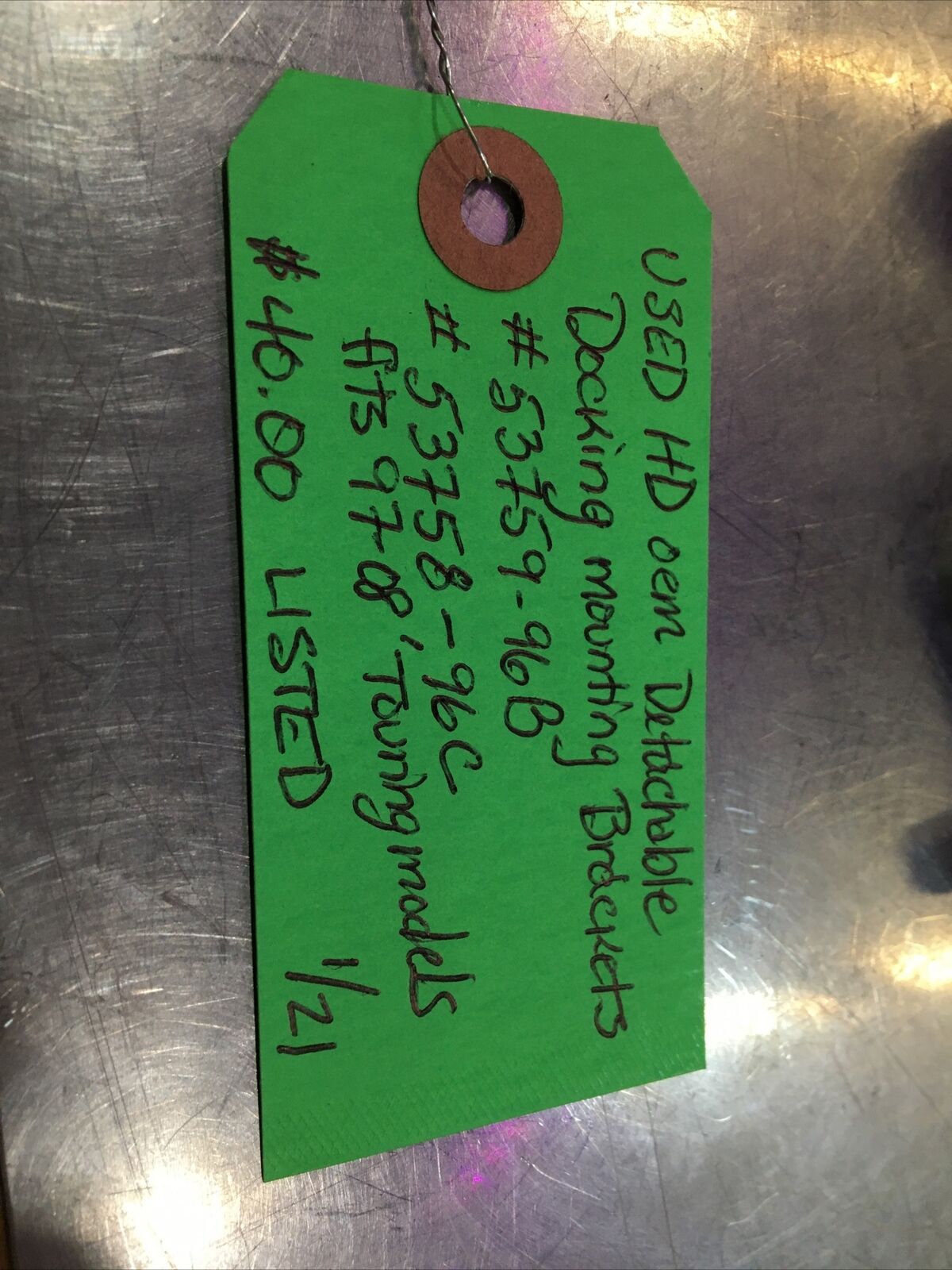Harley Davidson oem Detachable Docking Mounting Brackets #53759-96B/53758-96C. Condition is used. No hardware. Fits 97-08’ Touring models buyer is responsible for fitment and applications