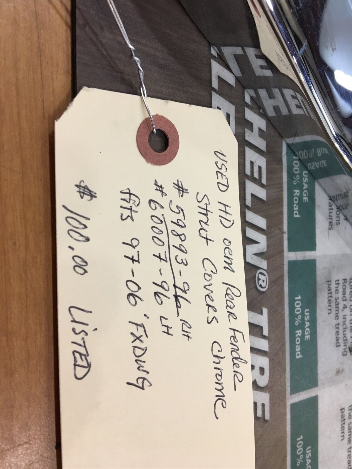 Harley Davidson oem Rear Fender Strut Covers Chrome #59893-96/60007-96. Condition is used. Has a little dent as seen in pictures. Fits 97-06’ FXDWG models buyer is responsible for fitment and applications