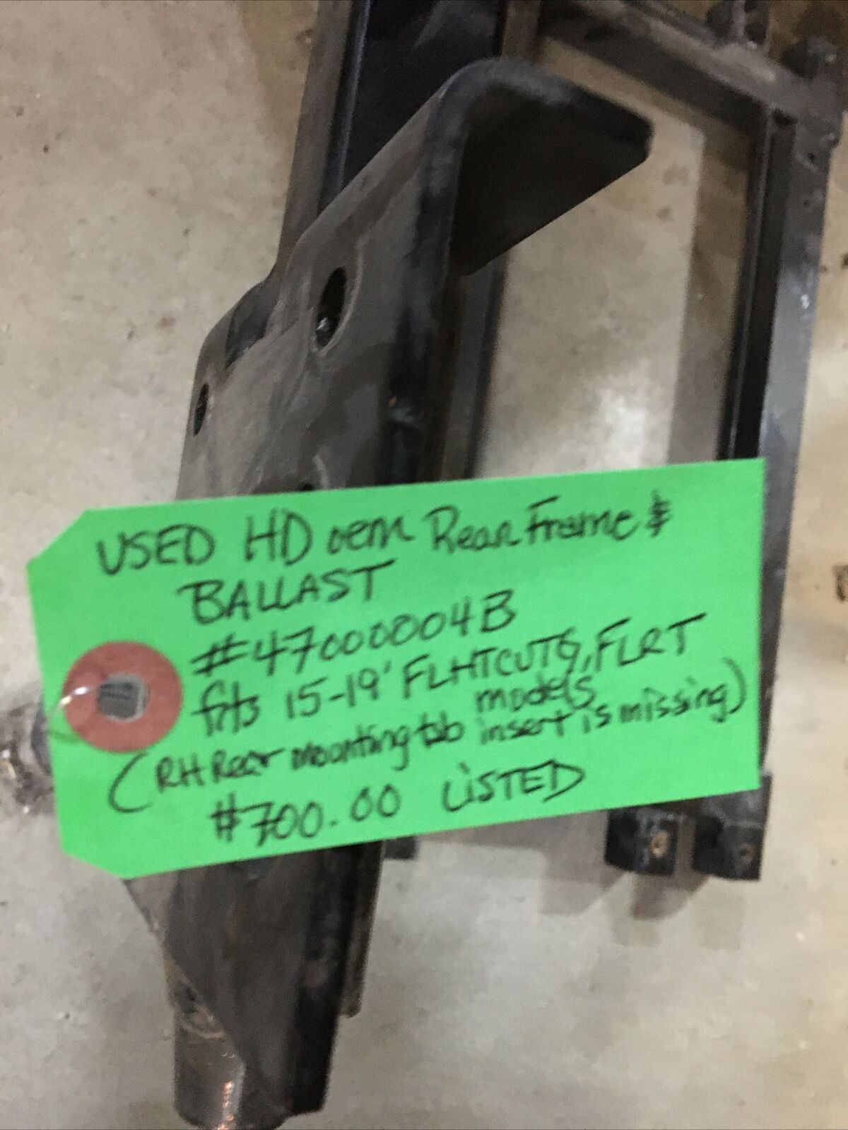 Harley Davidson oem Rear Frame & Ballast #47000004B. Condition is used. Right Rear mounting tab threaded insert is missing. Fits 15-19’ FLHTCUTG, FLRT models buyer is responsible for fitment and applications