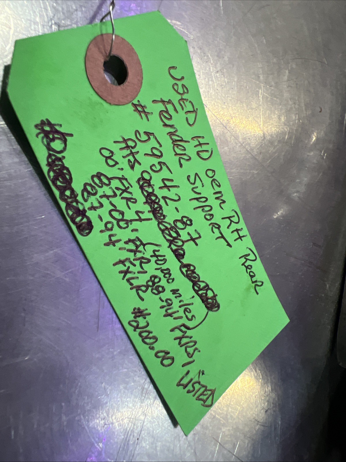 Harley Davidson oem RH Rear Fender Support #59542-87. Condition is used. Fits 87-00’ FXR, 88-94’ FXRS, 87-94’ FXLR models buyer is responsible for fitment and applications