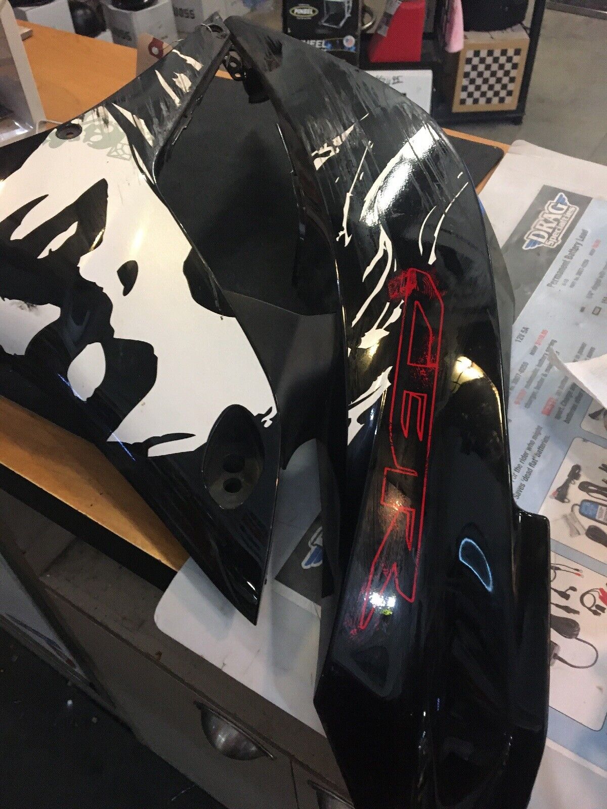 Honda RH Side Fairing Cowl And Lower Middle Cowl #64320-MFJH-A400/64310-MFJH-A40. Condition is Used.scratched and scuffed a small crack has some road rash with a small hole as seen in pictures Honda CBR600RR 09-12’ buyer is responsible for fitment and applications