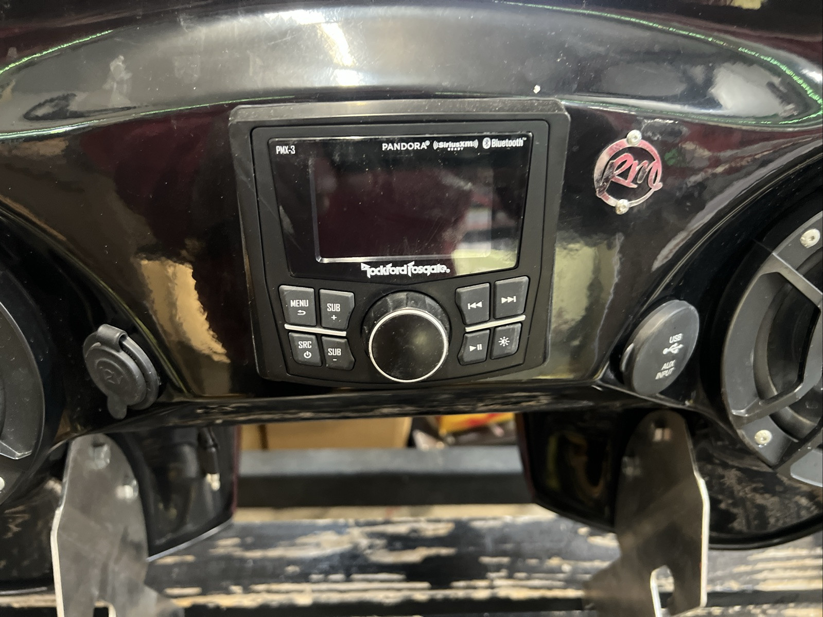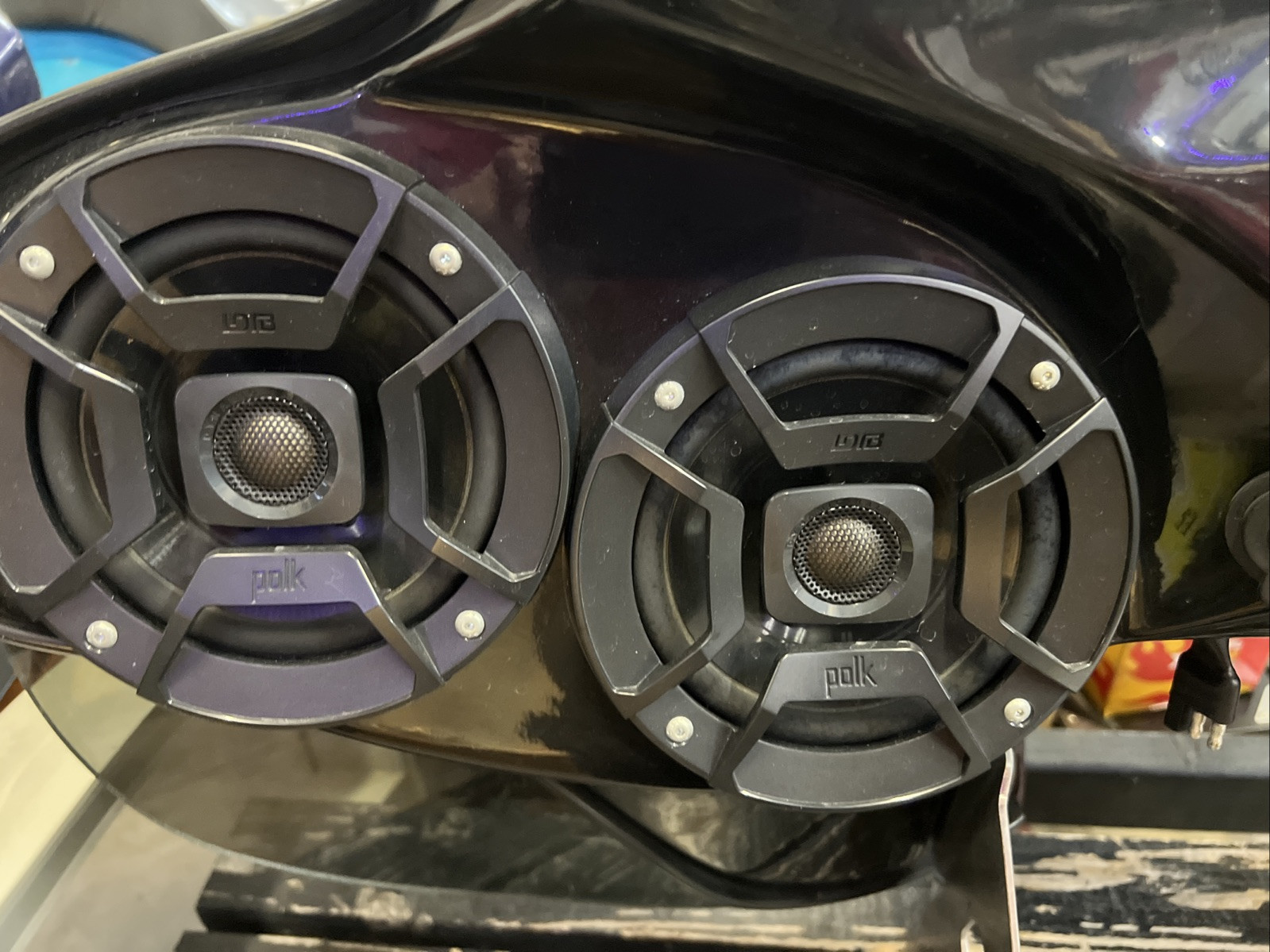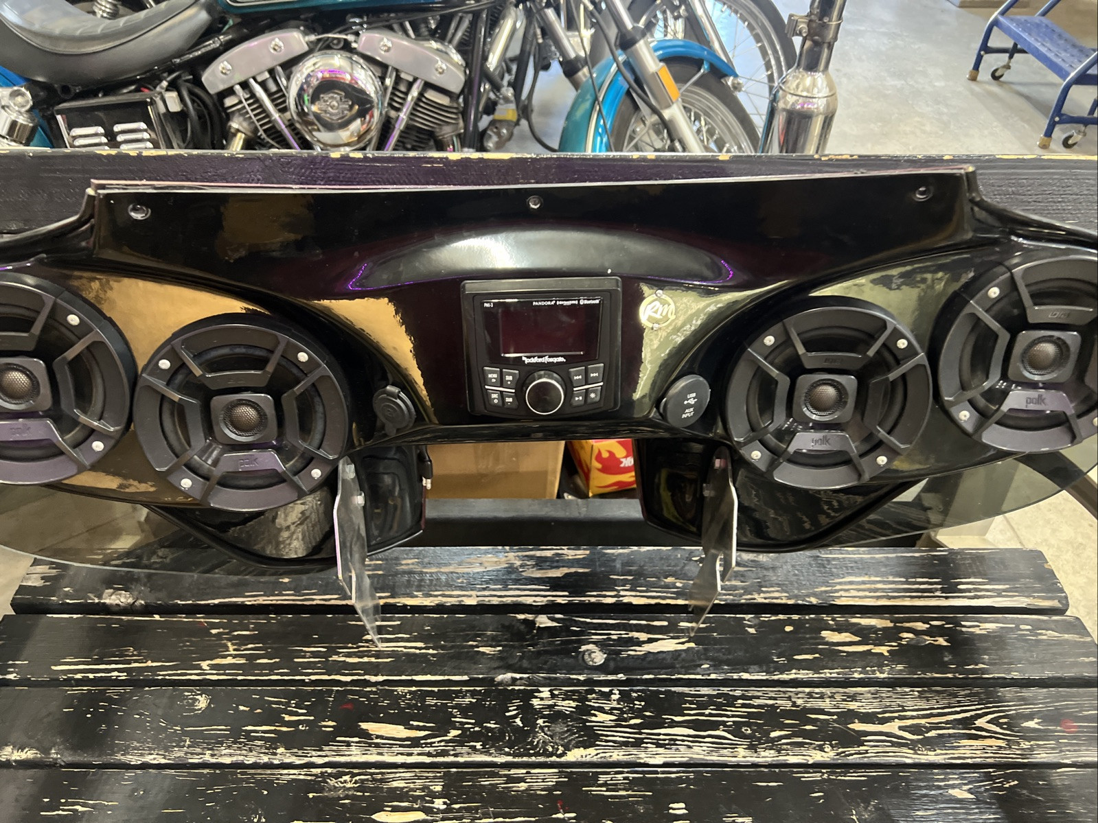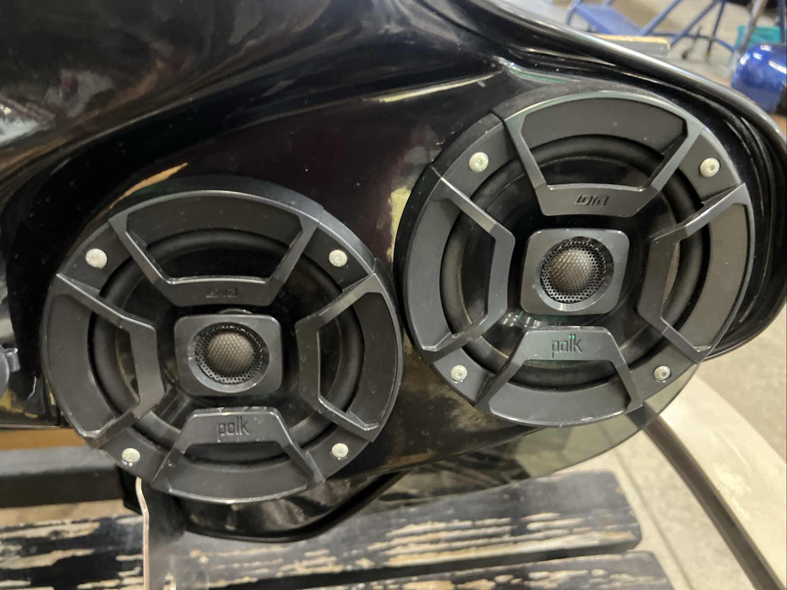 Reckless Motorcycles Batwing Fairing W/Stereo. Condition is used. Has some scratches and a couple paint chips. No windscreen, no hardware. Fits Harley Davidson FLHR models with oem passing lamp bar . Has 4 Polk Audio speakers and Rockford Fosgate Stereo buyer is responsible for fitment and applications