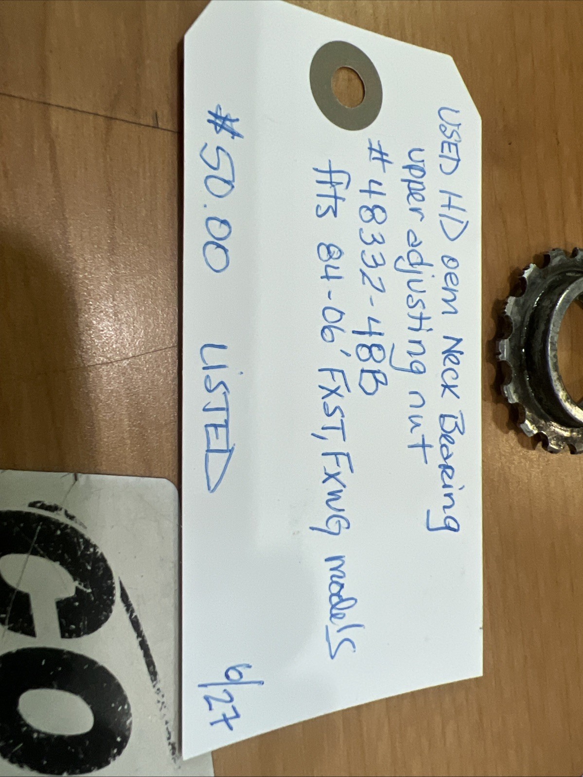 Harley Davidson oem Neck Bearing Upper Adjusting Nut #48332-48B. Condition is used. Fits 84-06’ FXST, FXWG models buyer is responsible for fitment and applications