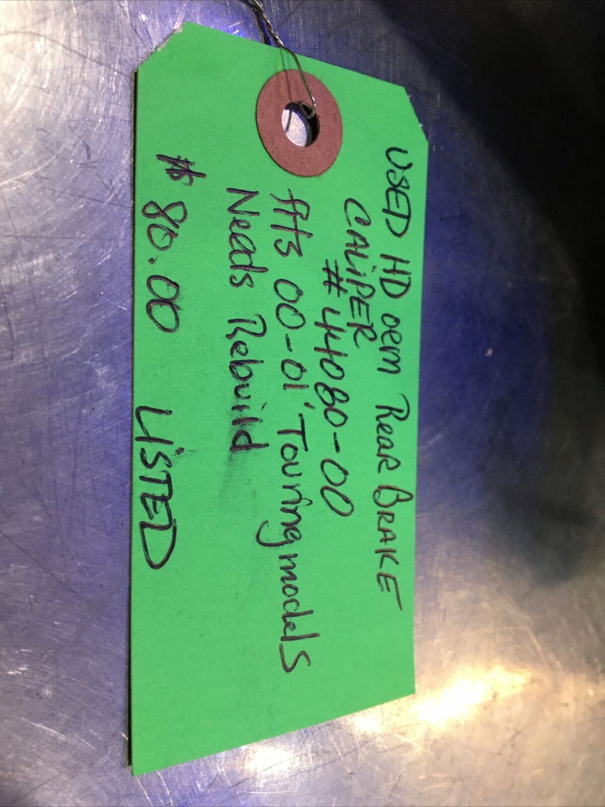 Harley Davidson oem Rear Brake Caliper #44080-00. Condition is used. Needs rebuilt. Fits 00-01’ Touring models buyer is responsible for fitment and applications