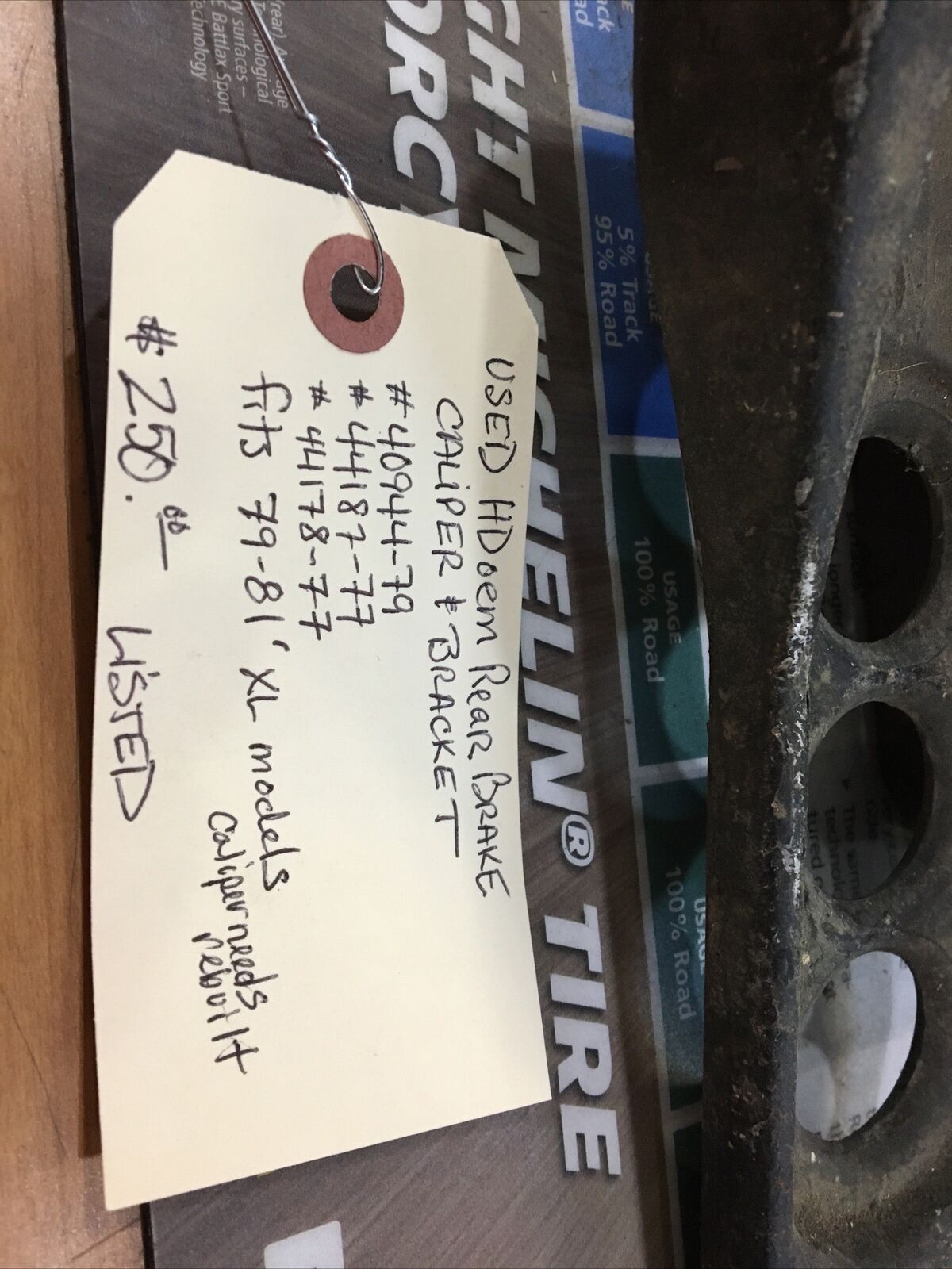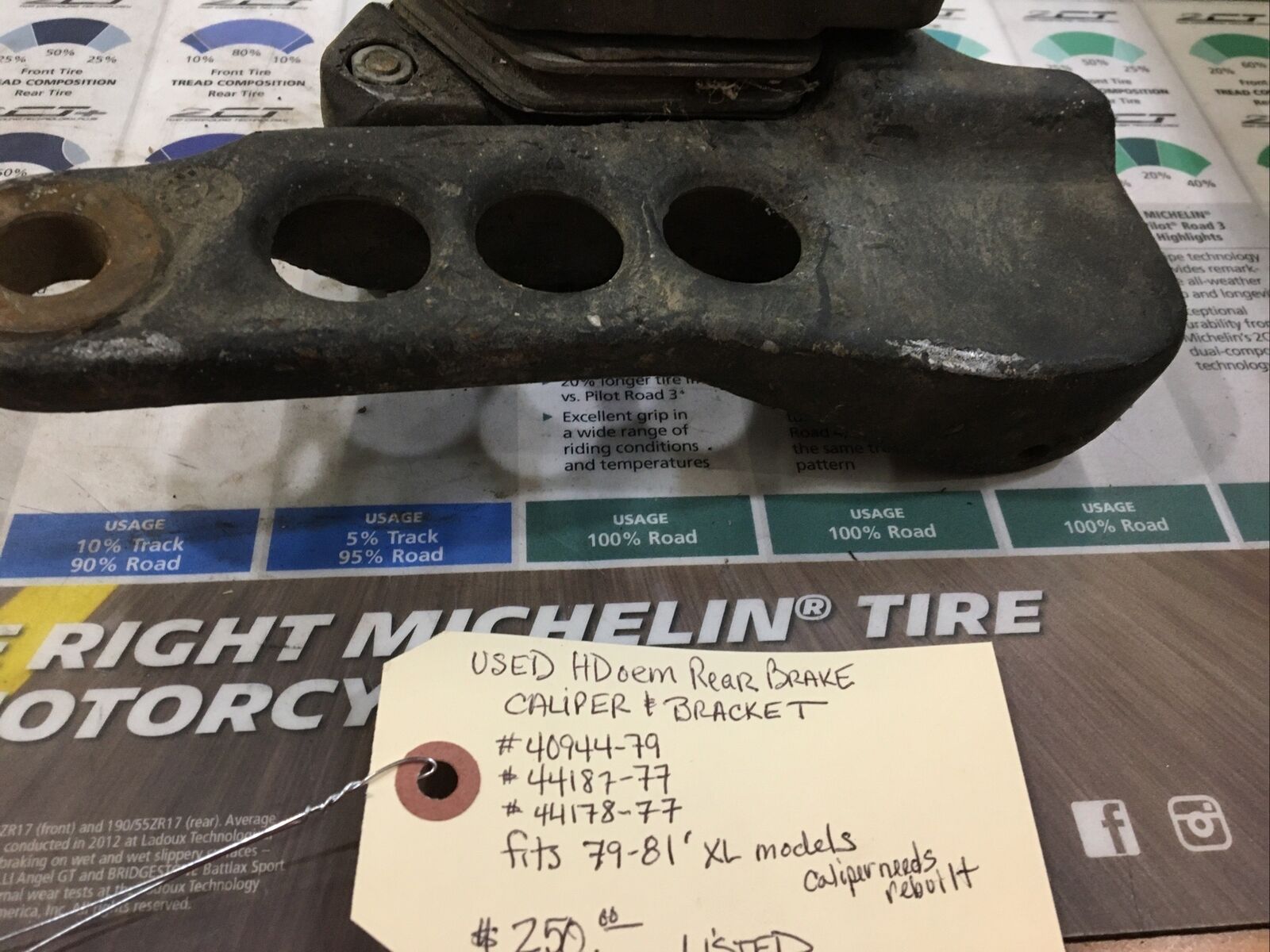 Harley Davidson oem Rear Brake Caliper and Bracket #40944-79/44187-77/44178-77. Condition is used caliper needs rebuilt. Fits 79-81’ XL models buyer is responsible for fitment and applications