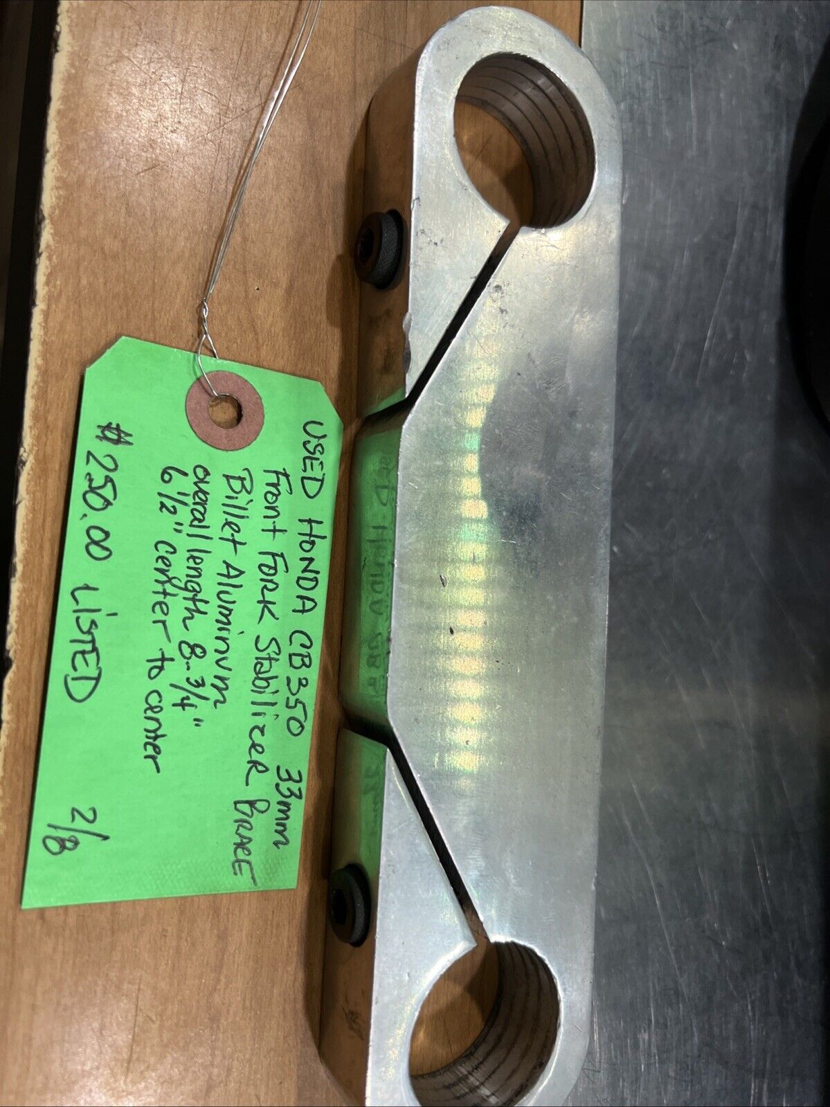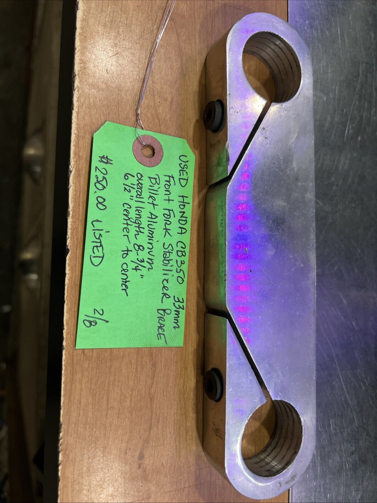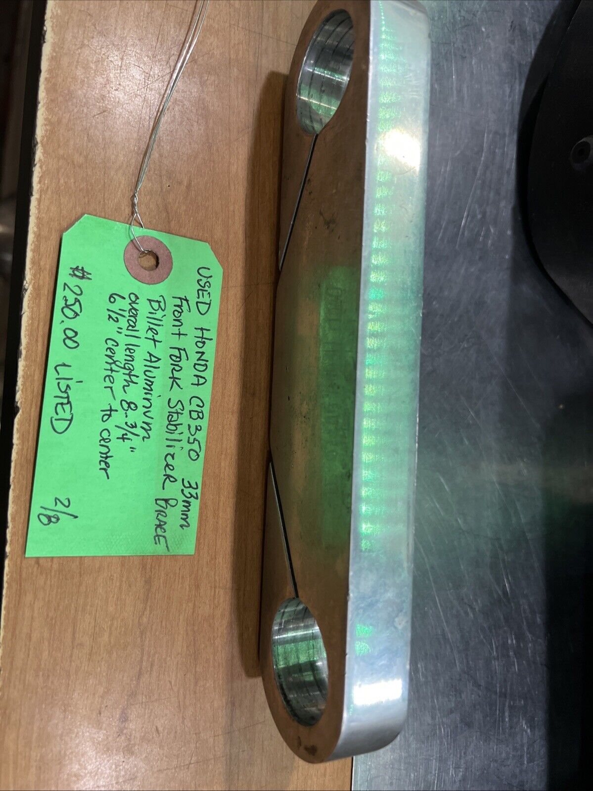 Honda CB350 33mm Front Fork Stabilizer Brace. Condition is used. Billet Aluminum overall length 8-3/4”, 6-1/2” Center to center buyer is responsible for fitment and applications