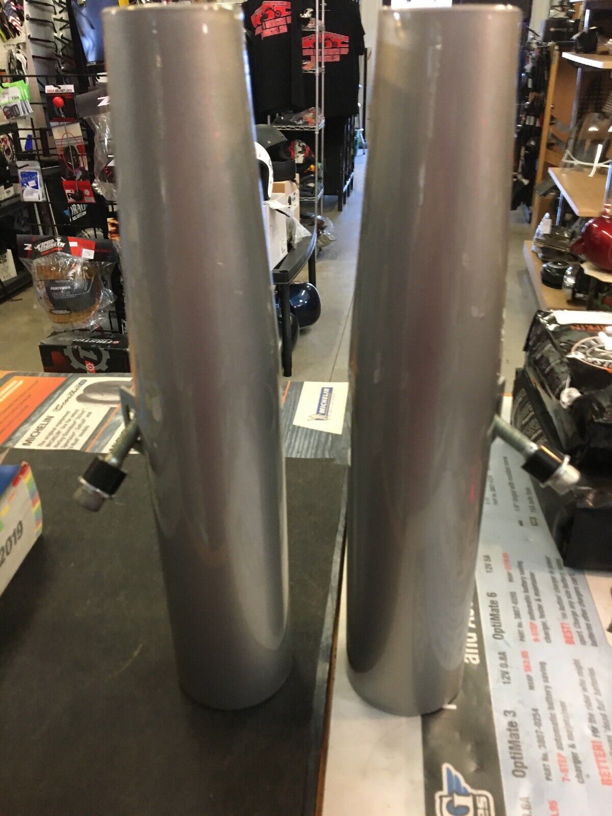 Lowbrow Customs 39mm Fork Shrouds. Condition is Used.painted silver great condition requires front fender removal measures 13-5/8” length buyer is responsible for fitment and applications