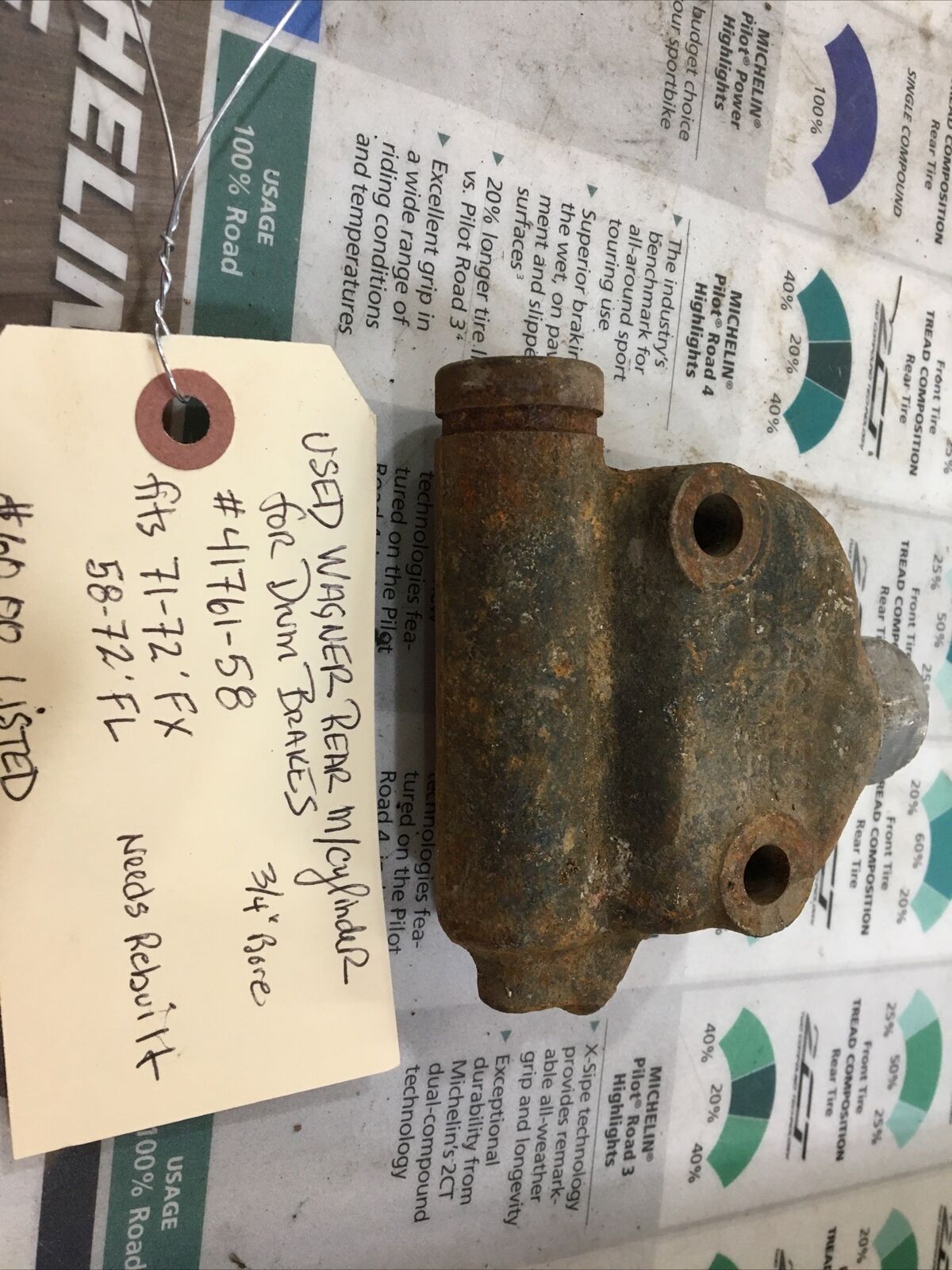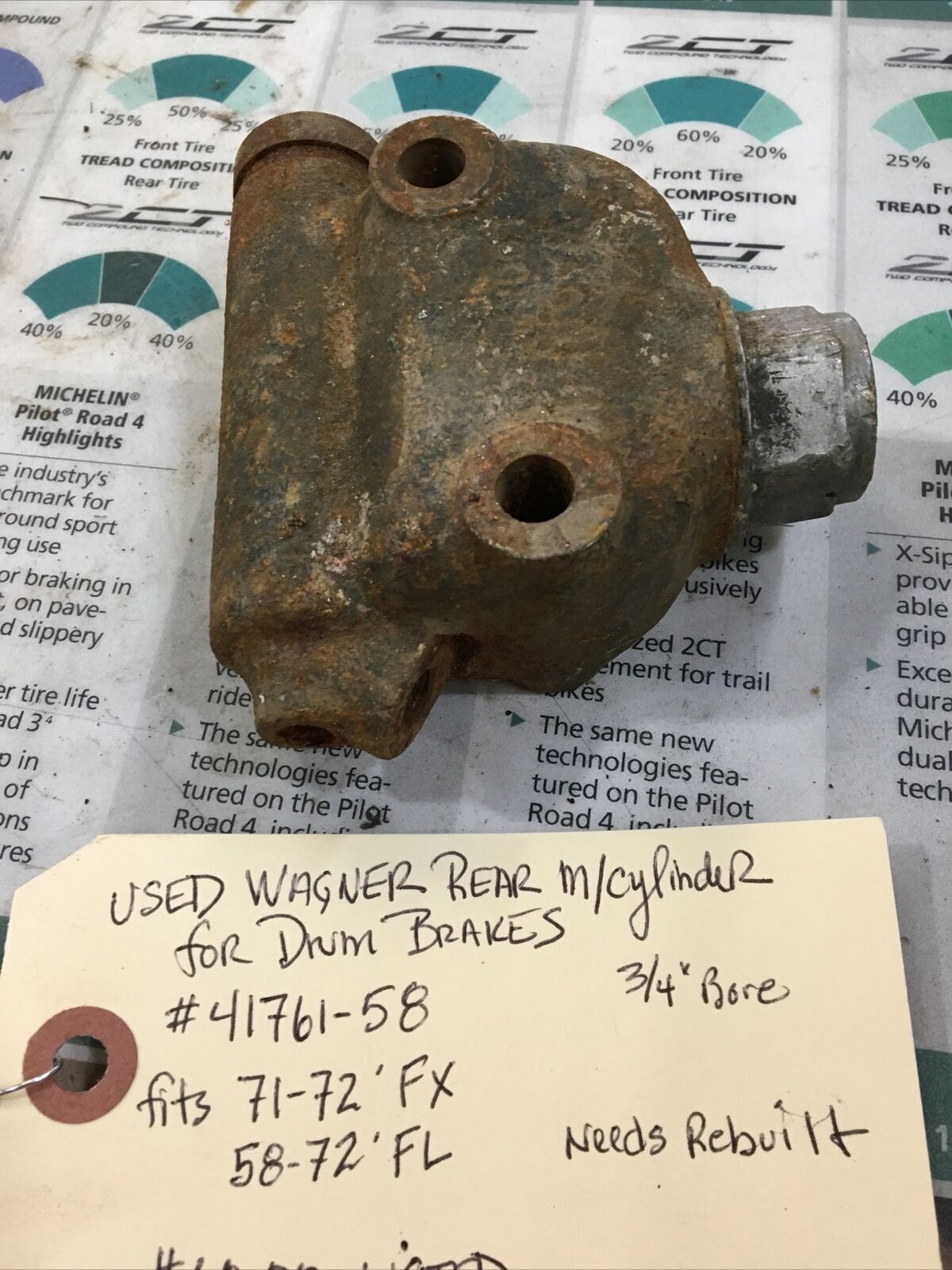 Wagner Rear Master Cylinder for Drum Brakes#41761-58. Condition is used. 3/4” bore. Needs rebuilt. Fits 71-72’ FX, 58-72’ FL models buyer is responsible for fitment and applications