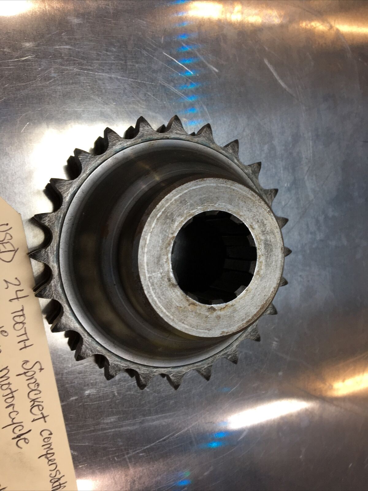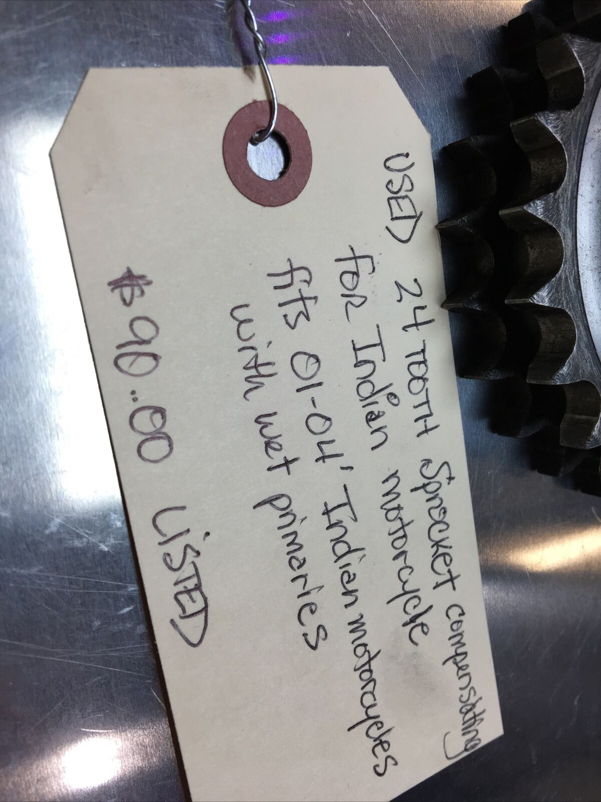 24 Tooth Sprocket Compensating for Indian Motorcycle. Condition is used. Fits 01-04’ Indian motorcycle with wet primaries. Buyer is responsible for fitment and applications