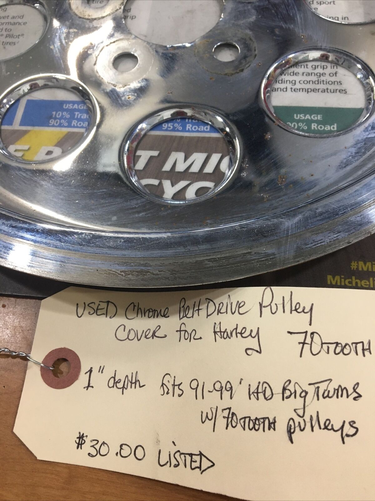 Chrome Belt Drive Pulley Cover for Harley. Condition is used as seen in pictures. Fits Harley Davidson 70 tooth pulleys 91-99’ Big Twins measures 1” depth buyer is responsible for fitment and applications