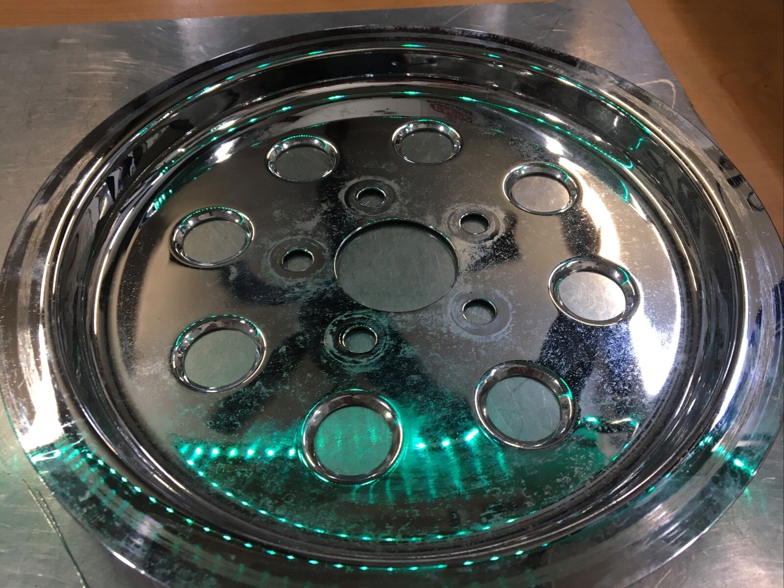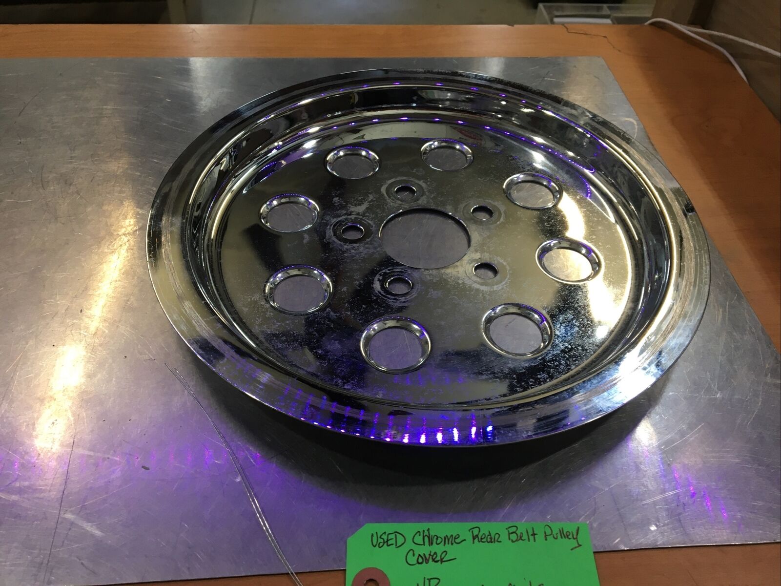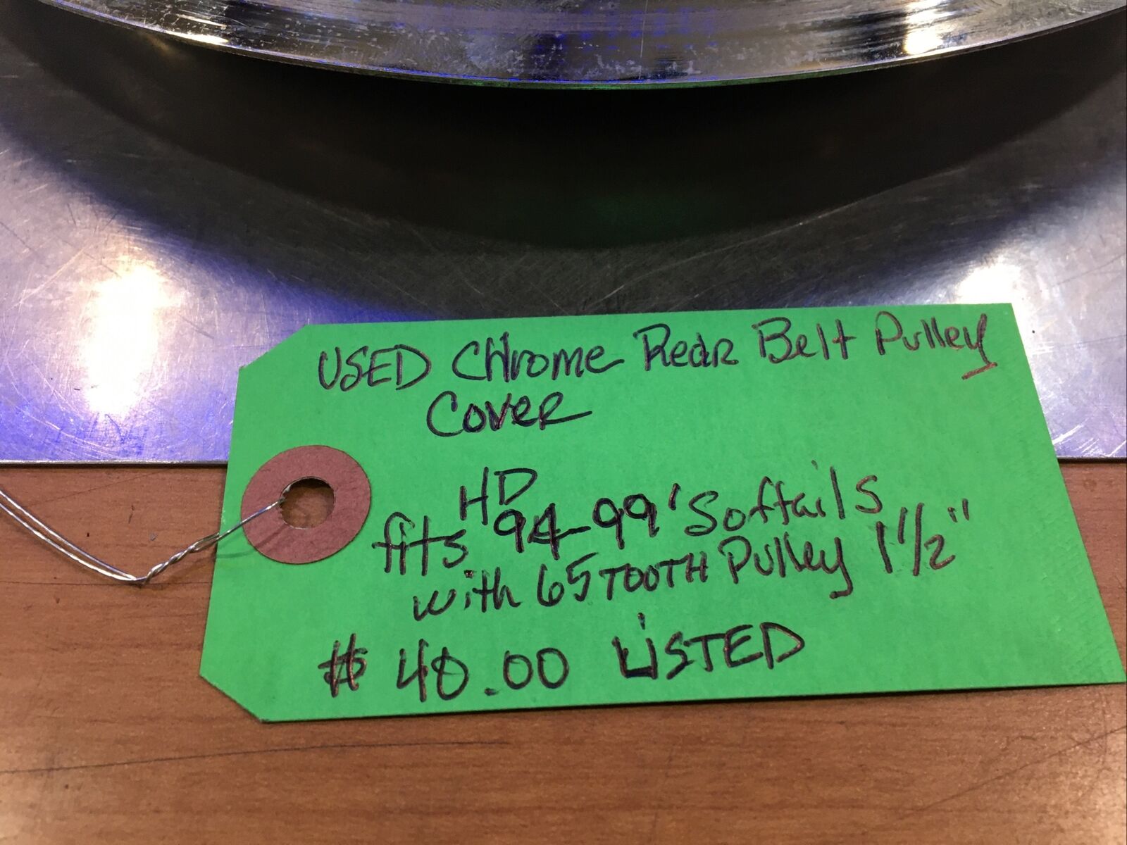Chrome Rear Belt Pulley Cover. Condition is used. Fits Harley Davidson 94-99’ Softails with 65 Tooth pulley 1-1/2” width buyer is responsible for fitment and applications