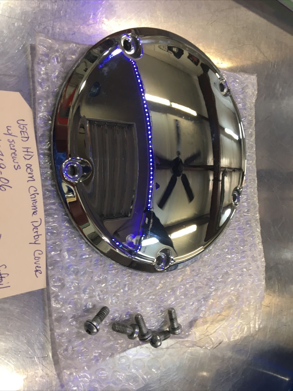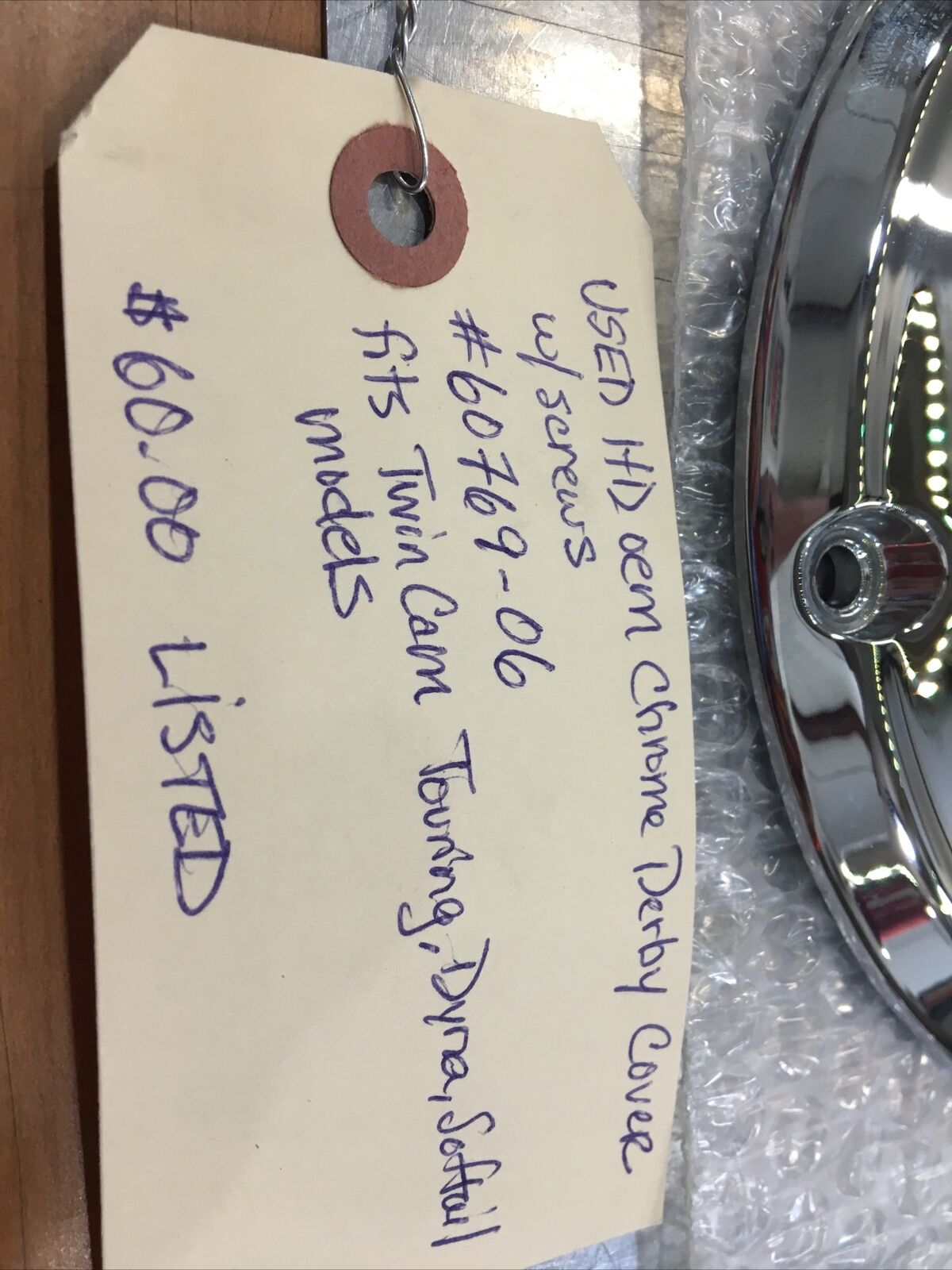 Harley Davidson oem Chrome Derby Cover w/screws #60769-06. Condition is used. Screws are not chrome. Fits Twin Cam Touring, Dynas and Softails buyer is responsible for fitment and applications