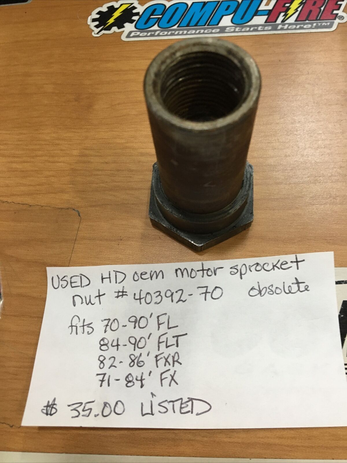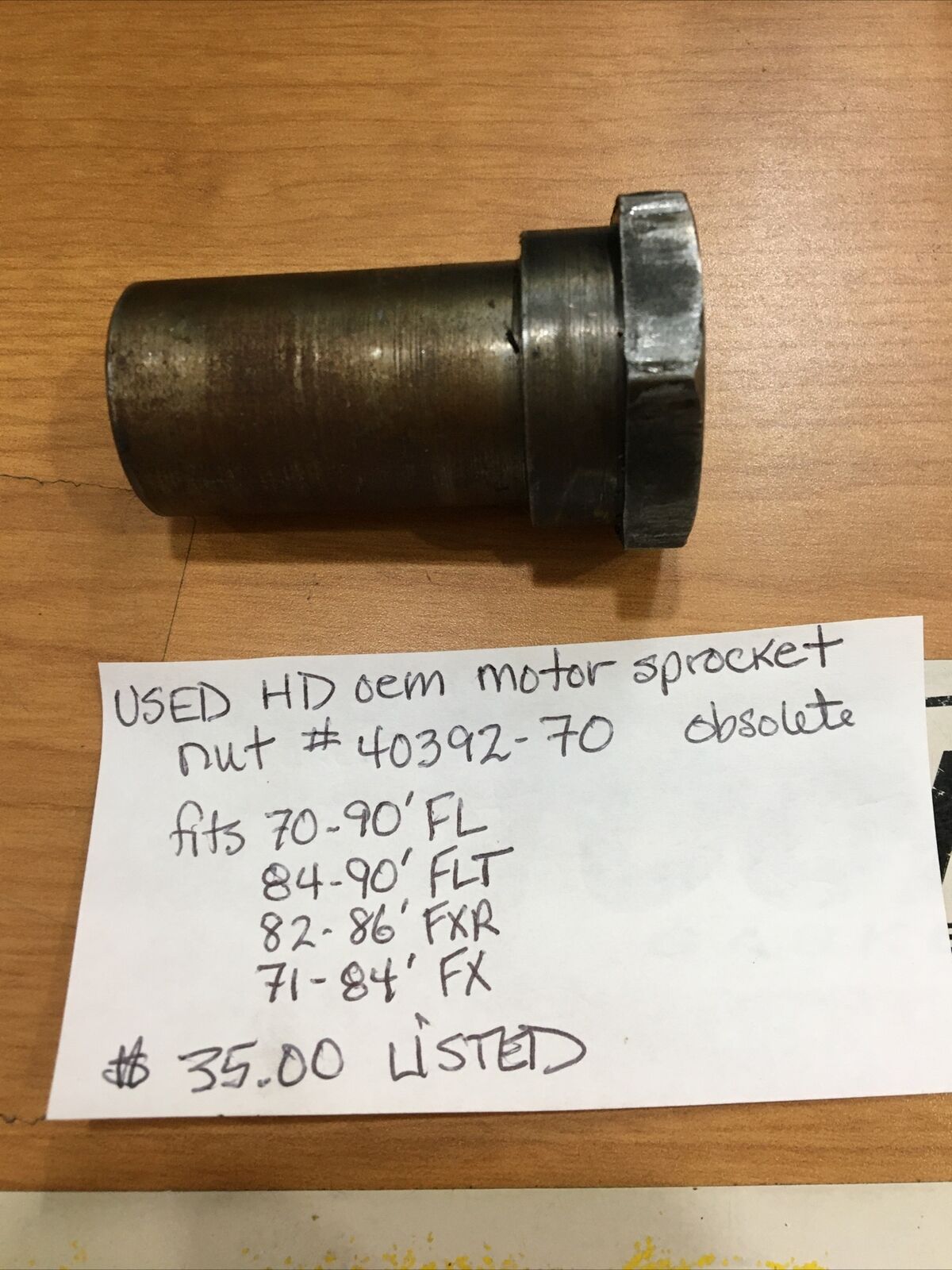 Harley Davidson Oem Motor Sprocket Nut #40392-70. Condition is used. Obsolete item fits 70-90’ FL, 84-90’ FLT, 82-86’ FXR, 71-84’ FX models buyer is responsible for fitment and applications