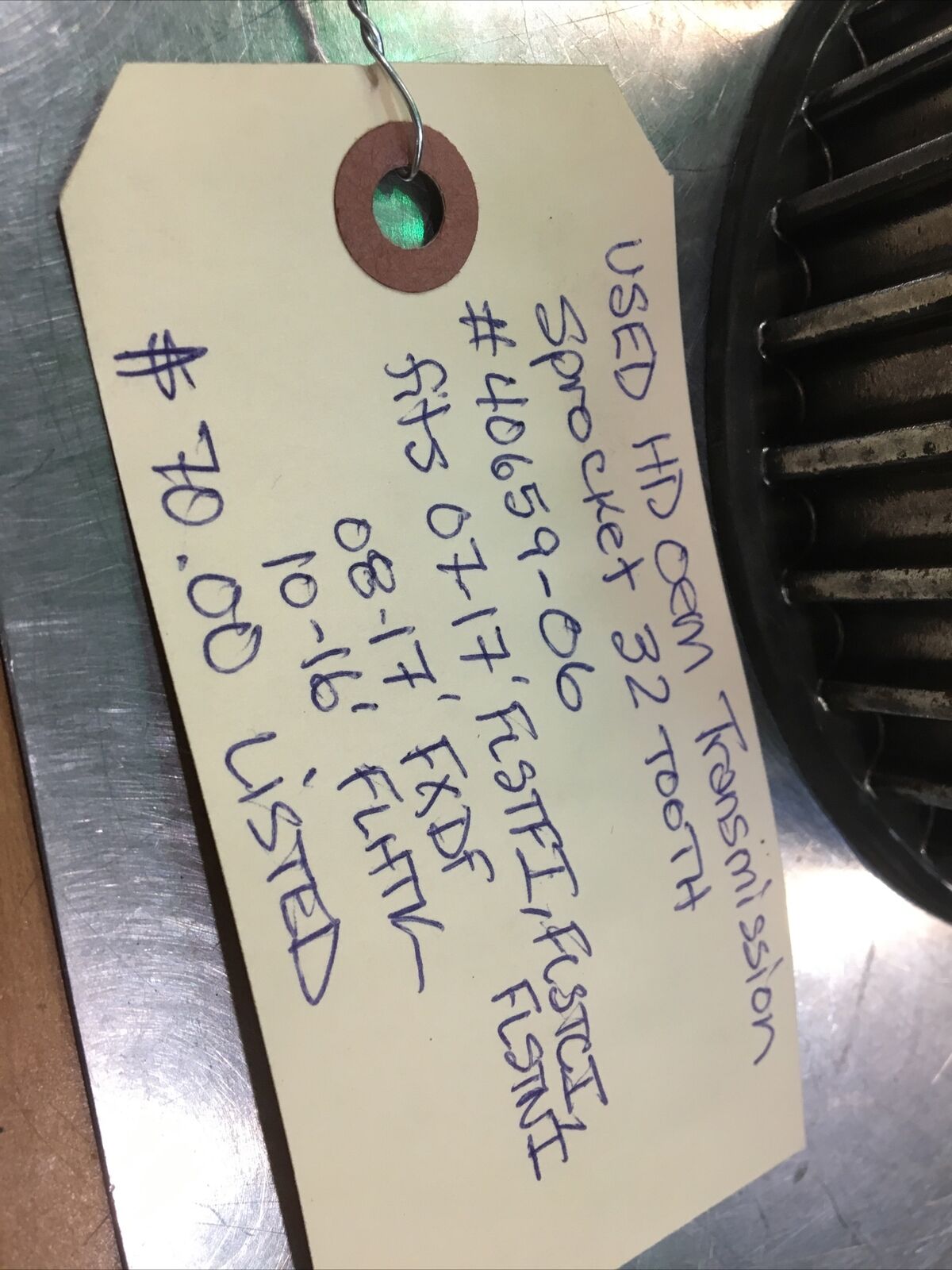 Harley Davidson oem Transmission Sprocket 32 Tooth #40659-06. Condition is used. Fits 07-17’ FLSTFI, FLSTCI, FLSTNI, 08-17’ FXDF, 10-16’ FLHTK models buyer is responsible for fitment and applications