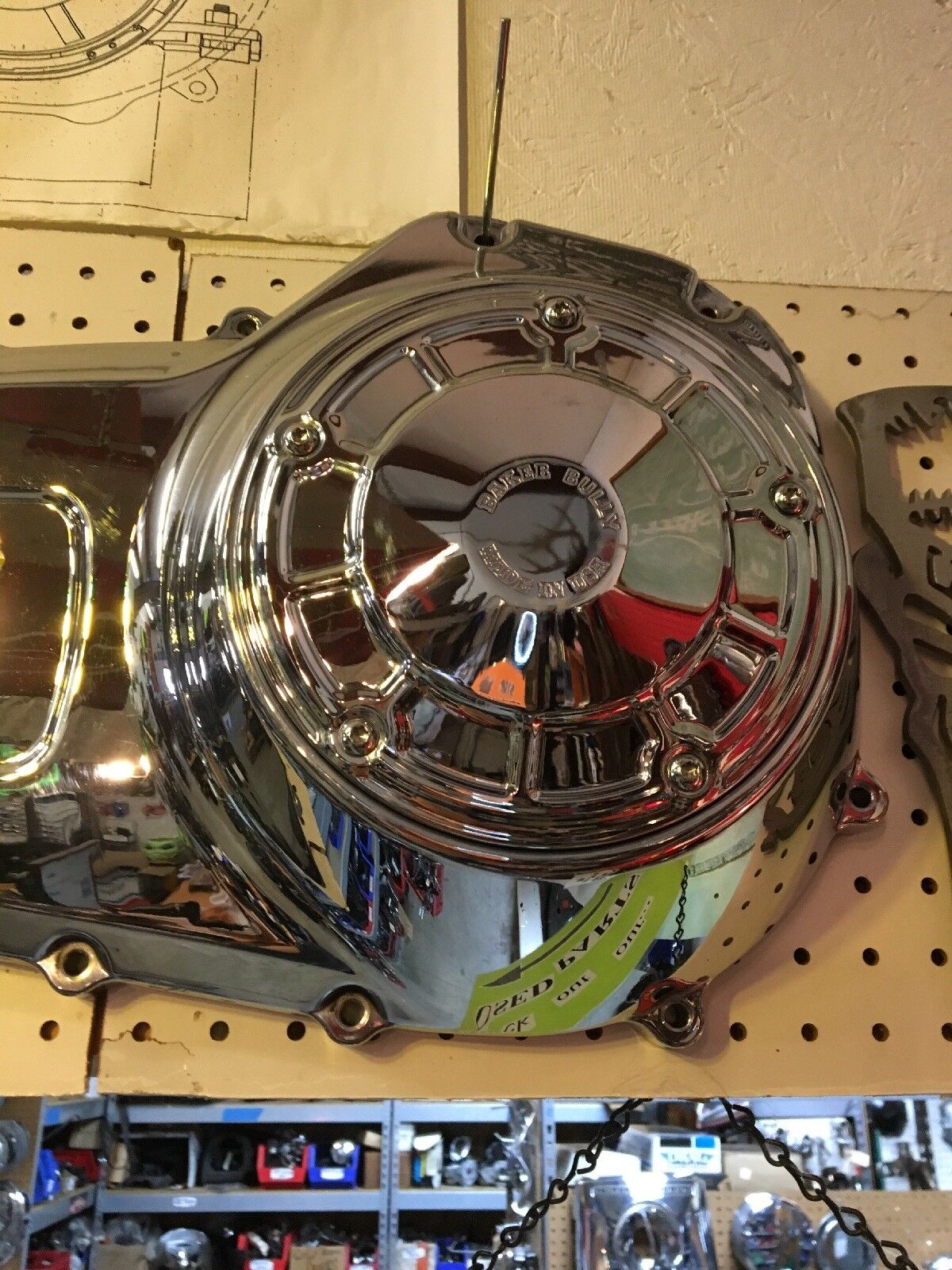 Used HD chrome outer primary cover with baker bully derby cover fits 07-11’ Touring models buyer is responsible for fitment and applications