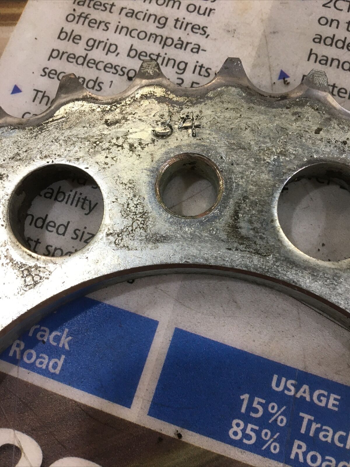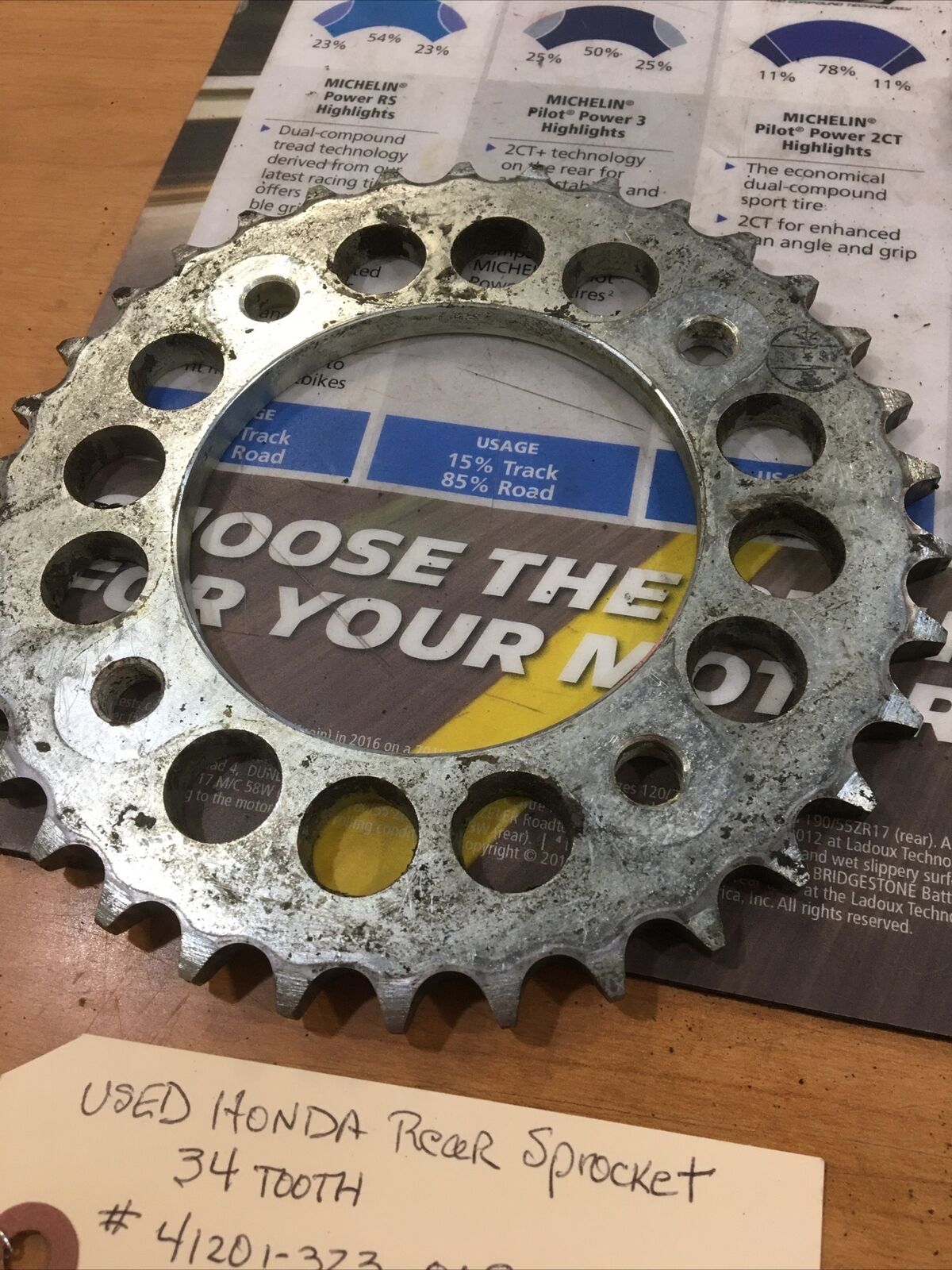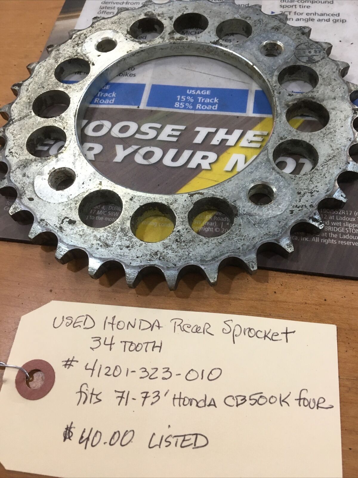 Honda Rear Sprocket 34 Tooth #41201-323-010. Condition is used. Fits Honda 71-73’ CB500K Four buyer is responsible for fitment and applications