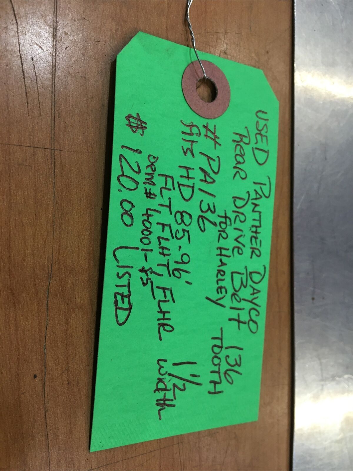 Panther Dayco Rear Drive Belt 136 Tooth for Harley 1-1/2” width #PA136. Condition is used. Fits Harley Davidson 85-96’ FLT, FLHT, FLHR models replaces oem #40001-85 buyer is responsible for fitment and applications