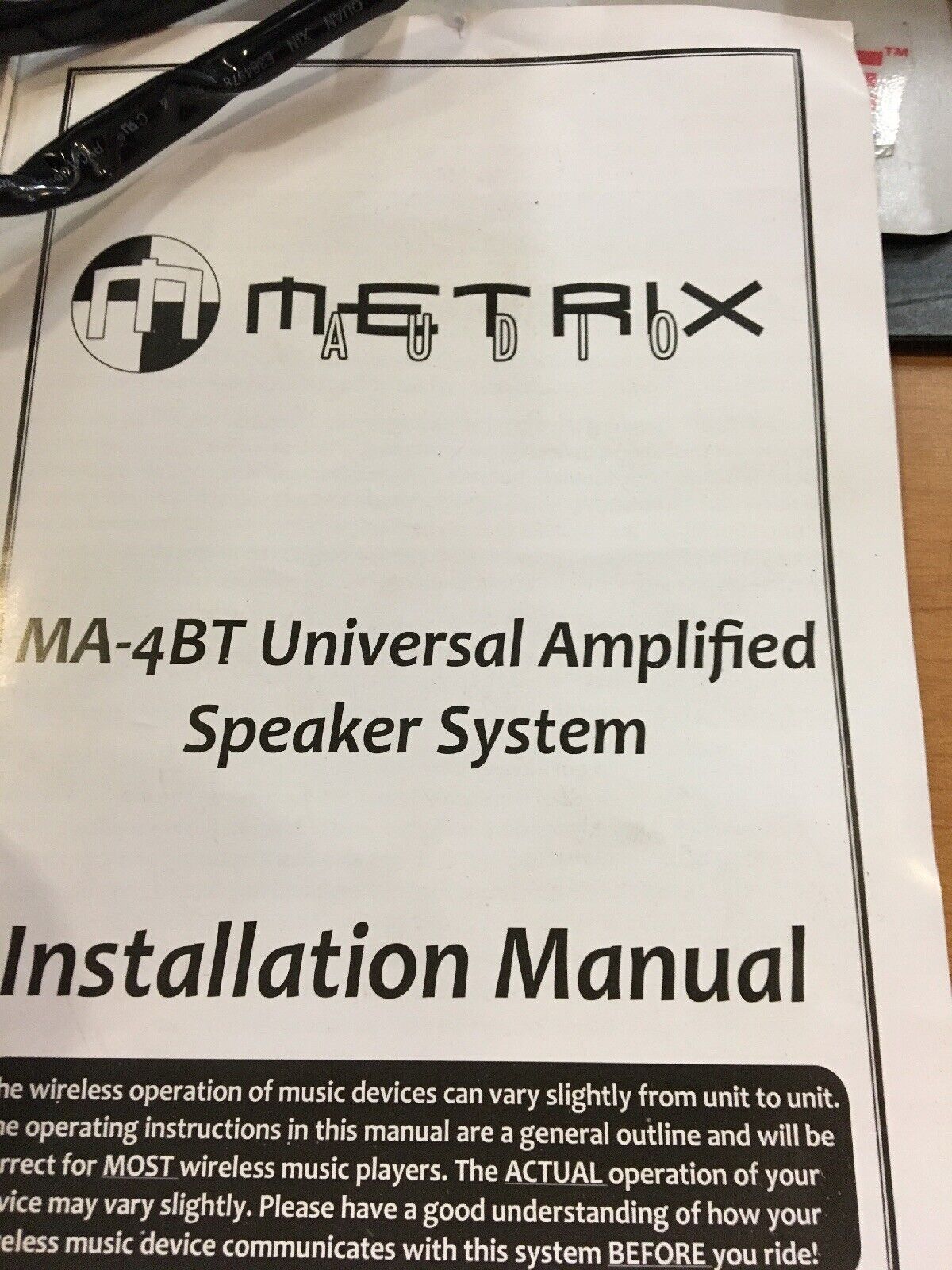 Metrix Audio Universal Amplified Speaker System #MA-4BT. Condition is New.universal audio kit works on motorcycles,atvs, utvs, golf carts, etc looks as if kit is missing in line fuse because it was wired for demonstration use buyer is responsible for fitment and applications