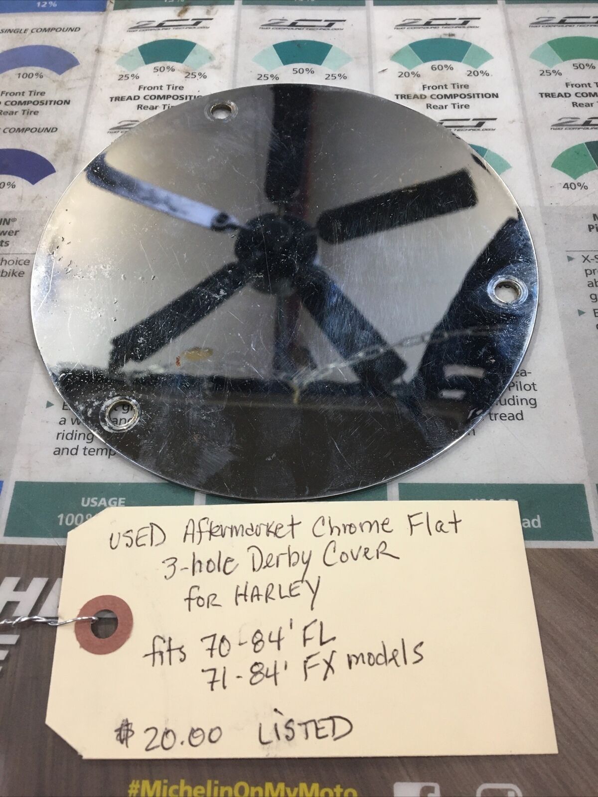 Aftermarket Chrome Flat 3-hole Derby Cover for Harley. Condition is used. Fits Harley Davidson 70-84’ FL, 71-84’ FX models buyer is responsible for fitment and applications