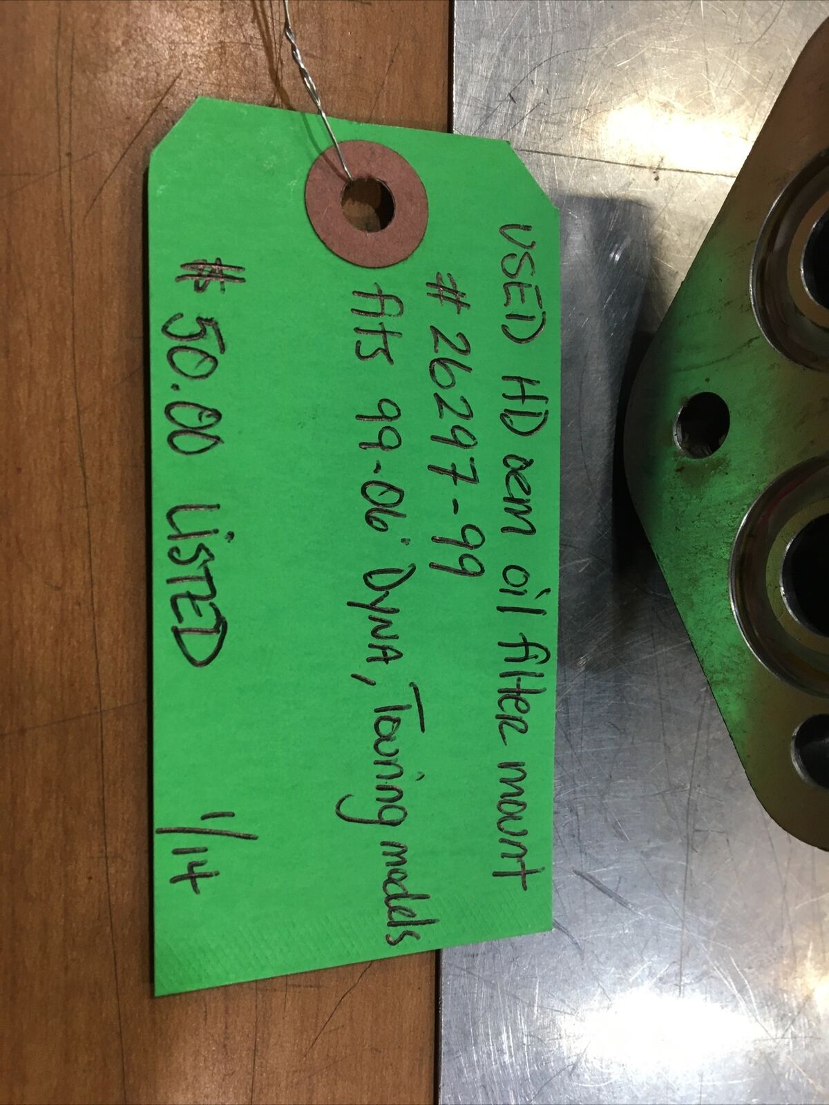 Harley Davidson oem Oil Filter Mount #26297-99. Condition is used. Fits 99-06’ Dyna, Touring models buyer is responsible for fitment and applications