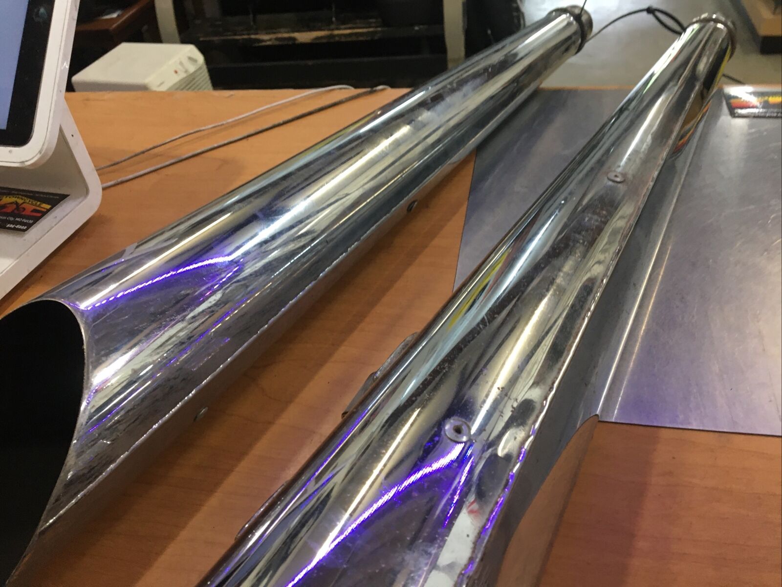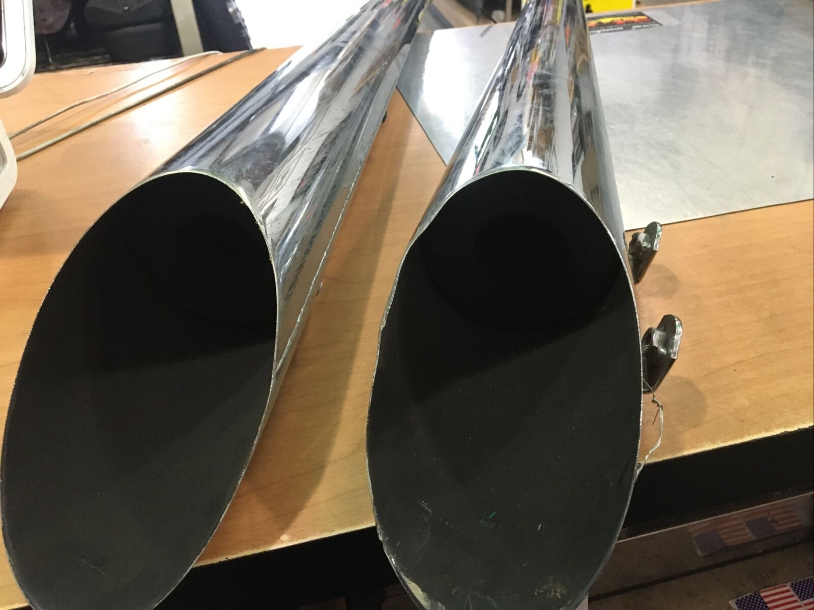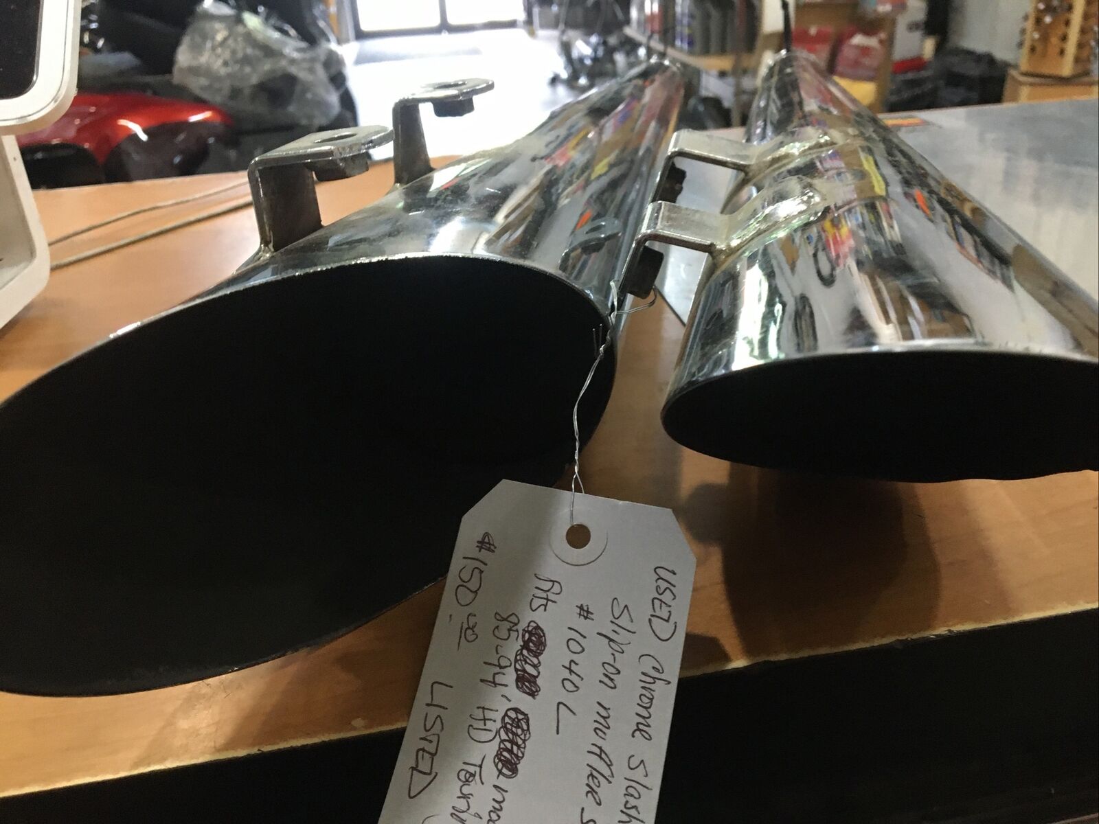 Chrome Slash Cut Slip-on Mufflers #1040L. Condition is used as seen in pictures. They have baffles.Fits Harley Davidson 85-94’ Touring models buyer is responsible for fitment and applications