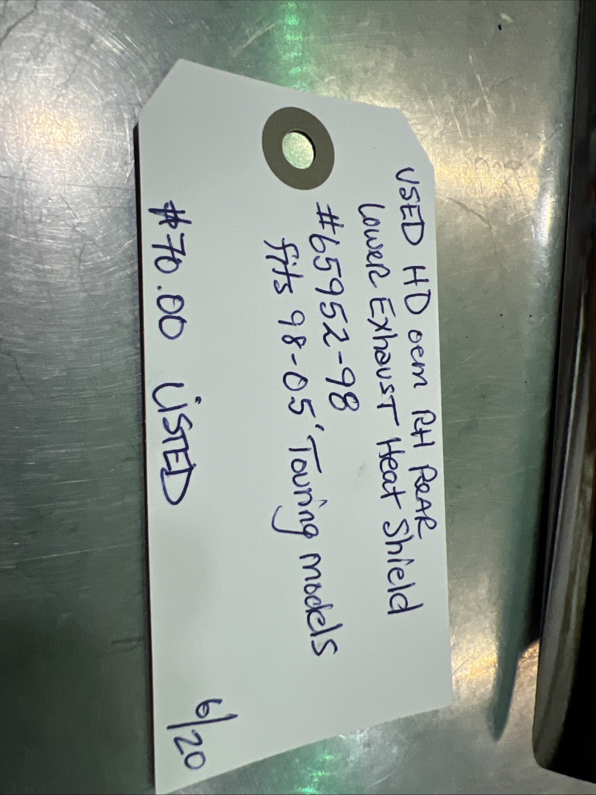 Harley Davidson oem RH Rear Lower Exhaust Heat Shield #65952-98. Condition is used. No clamps, scratches and a couple little dings. Fits 98-05’ Touring models buyer is responsible for fitment and applications