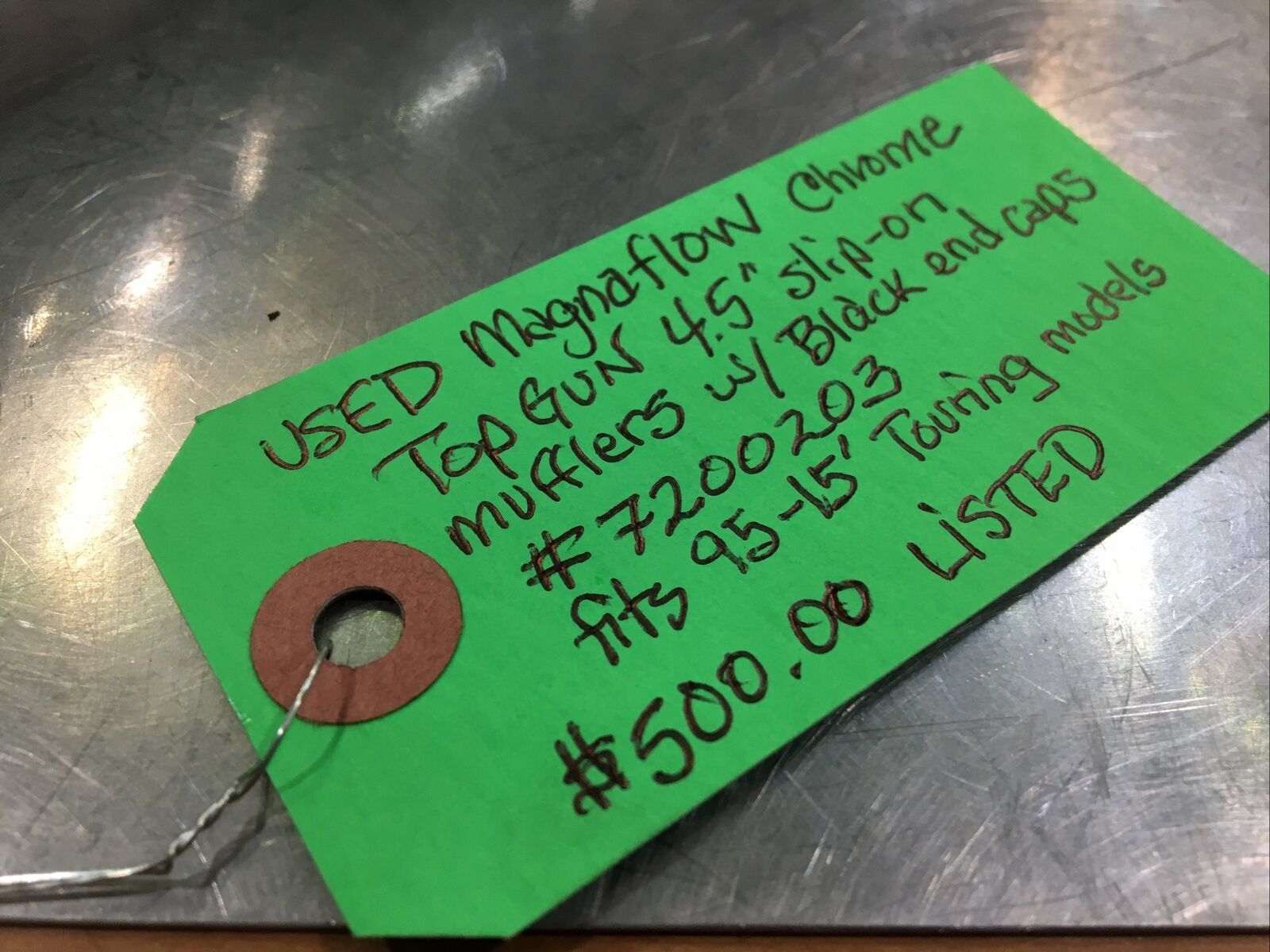 Magnaflow Chrome TopGun 4.5” Slip-on Mufflers w/Black end caps #7200203. Condition is used. Fits Harley Davidson 95-15’ Touring models buyer is responsible for fitment and applications