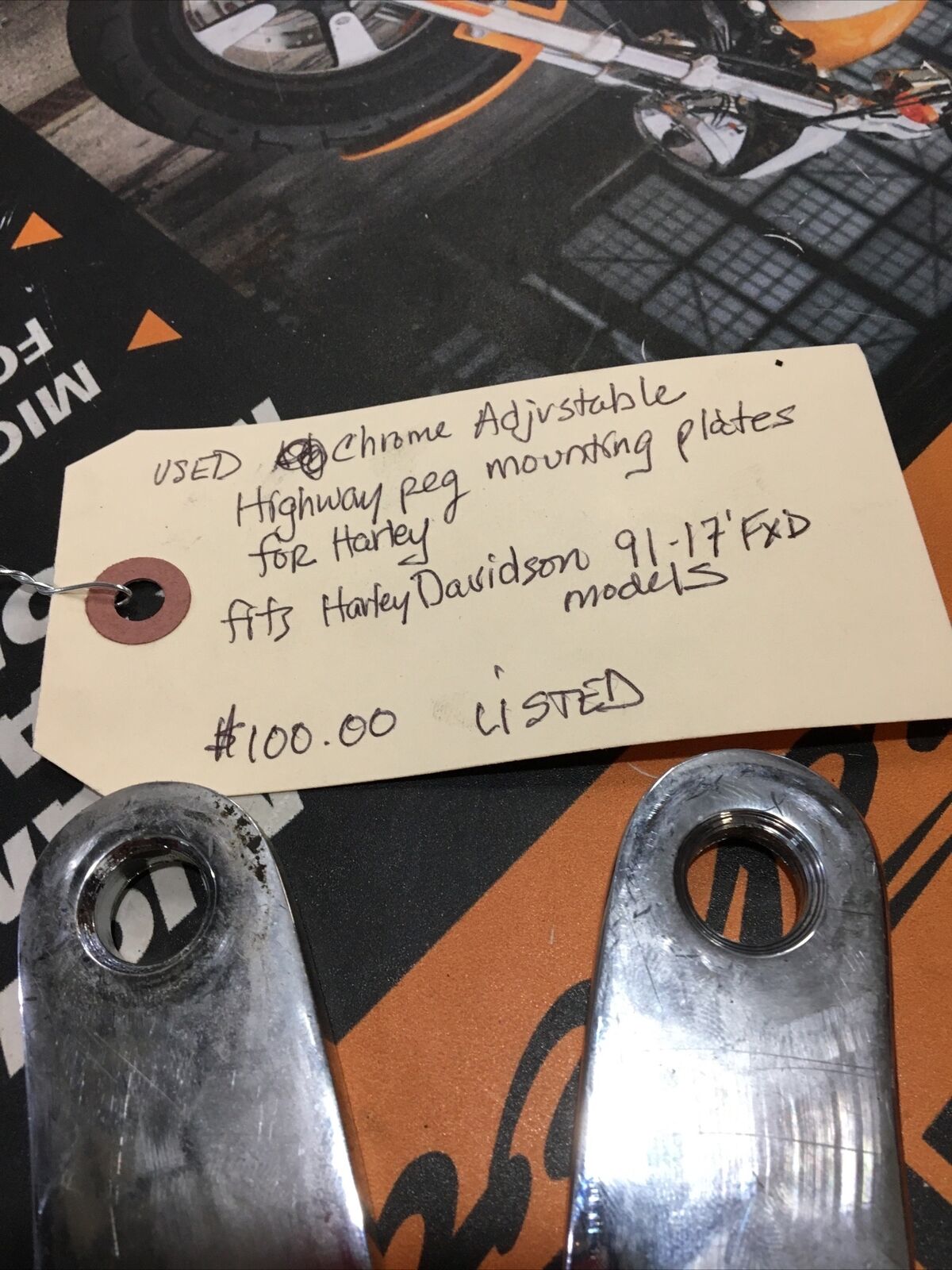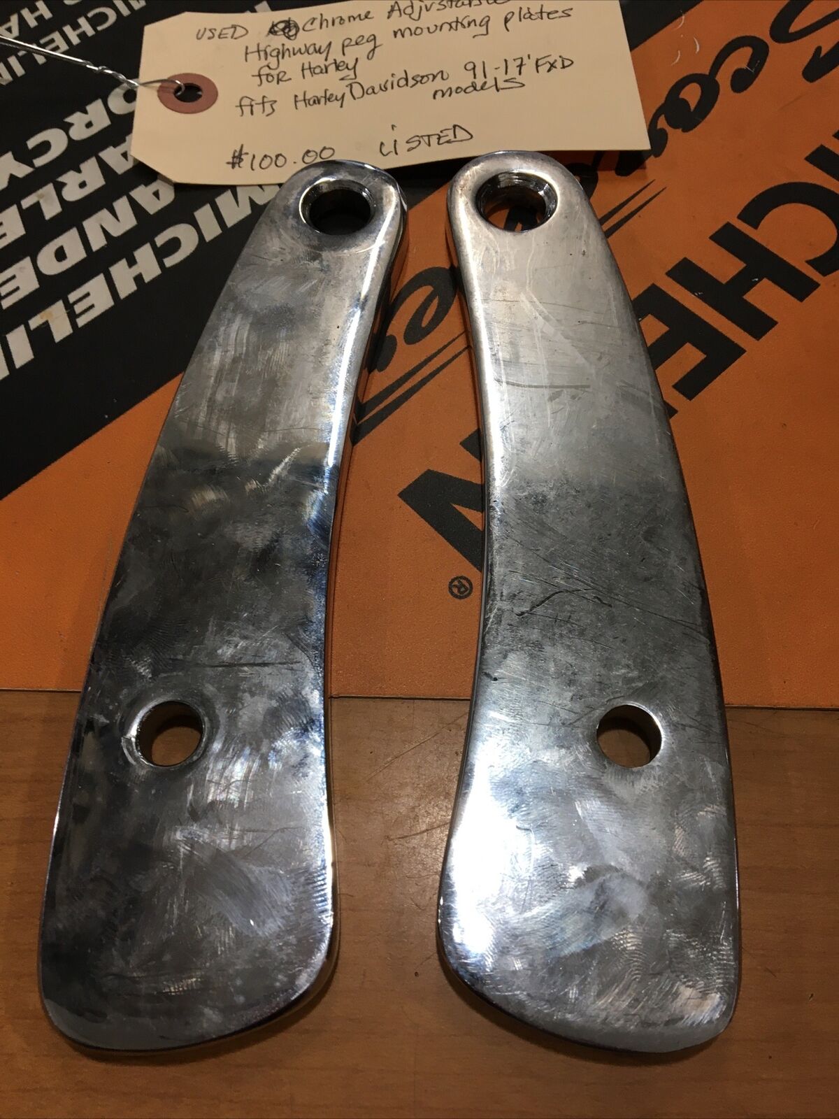 Chrome Adjustable Highway Peg Mounting Plates for Harley . Condition is used.Fits Harley Davidson 91-17’ FXD models buyer is responsible for fitment and applications