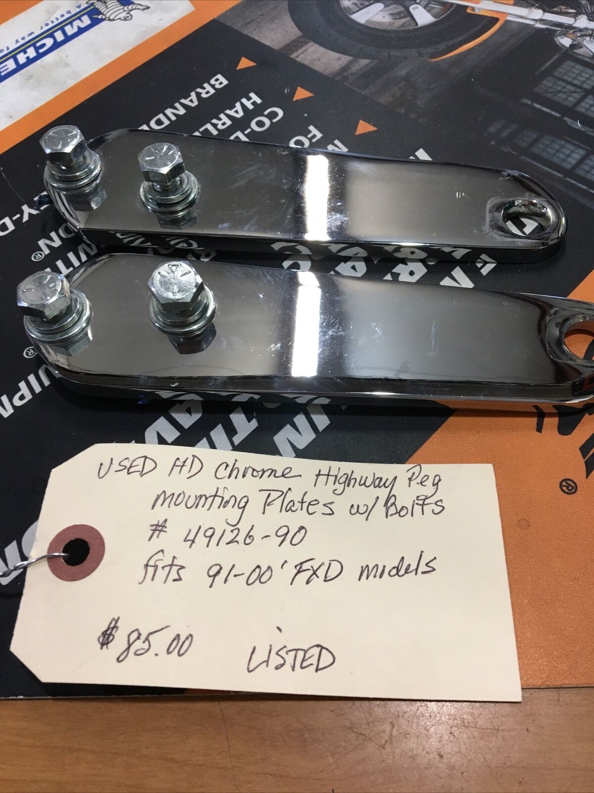 Harley Davidson Chrome Highway Peg Mounting Plates with bolts #49126-90. Condition is used. Fits 91-00’ FXD models buyer is responsible for fitment and applications