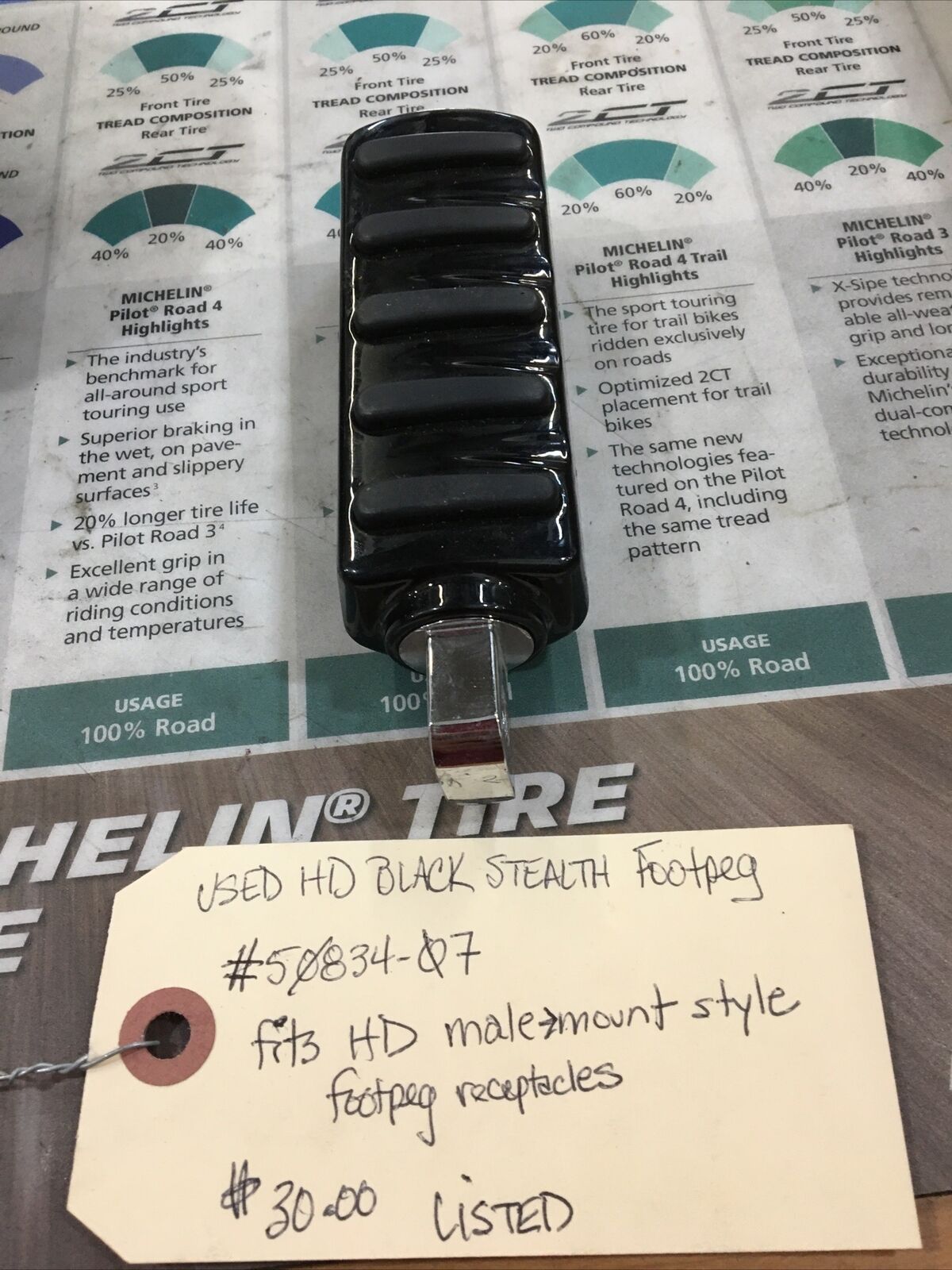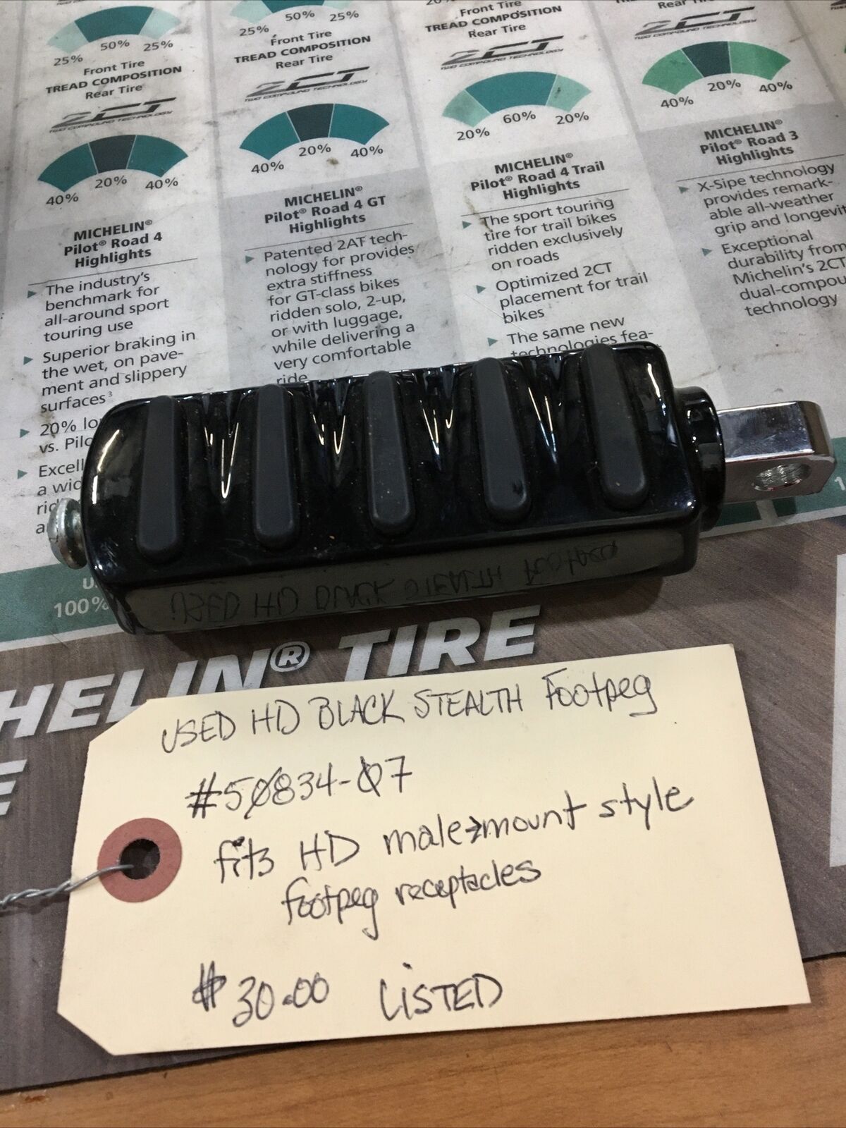 Harley Davidson oem Black Stealth Footpeg #50834-07. Condition is used. Fits HD male-mount Footpeg receptacles buyer is responsible for fitment and applications
