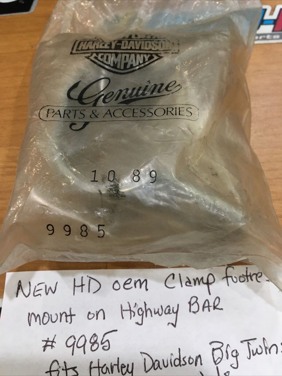 Harley Davidson oem Clamp Footrest mount on Highway Bar #9985. Condition is new. Fits Harley Davidson Big Twins with 1-1/4” engine guards buyer is responsible for fitment and applications